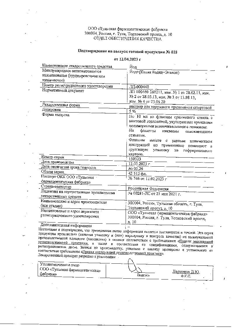 вспомогательные вещества: калия йодид 2,0 г, этанол (этиловый спирт) 95% 48,4 г, вода очищенная до 100 мл.