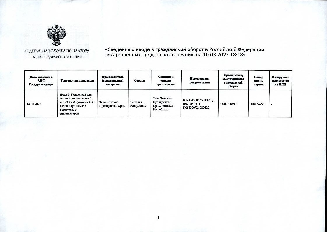 Перед использованием промывайте аппликаторы горячей водой и всегда проверяйте их целостность. Запрещается пользоваться поврежденным аппликатором. Использовать препарат Йокс - Тева спрей рекомендуется 2-4 раза в день.