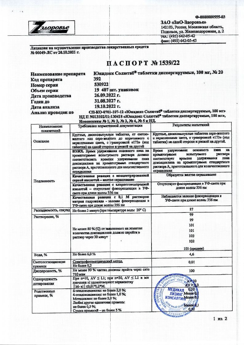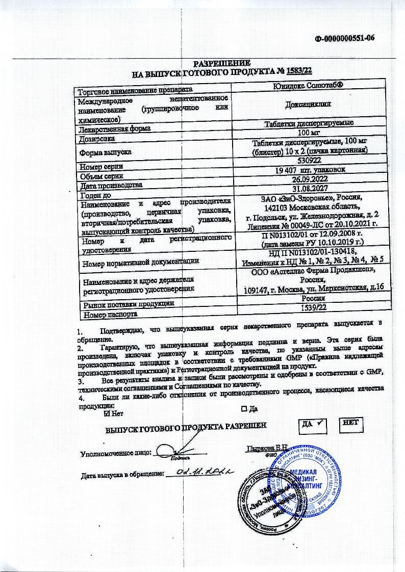При первичном сифилисе назначают по 100 мг два раза в день в течение 14 дней, при вторичном сифилисе - по 100 мг два раза в день в течение 28 дней. При неосложненных урогенитальных инфекциях, вызванных Chlamydia trachomatis, цервиците, негонококковом уретрите, вызванным Ureaplasma urealiticum, назначают по 100 мг 2 раза в сутки в течение 7 суток.