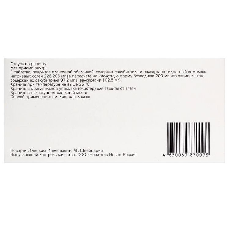 Активные вещества: сакубитрила и валсартана гидратный комплекс натриевых солей 226.202 мг, в пересчете на кислотную форму безводную 200 мг, что соответствует содержанию валсартана 102.8 мг, что соответствует содержанию сакубитрила 97.2 мг.