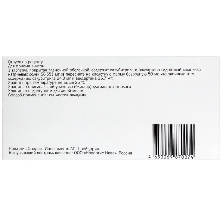 Активное вещество: сакубитрила и валсартана гидратный комплекс натриевых солей 56.551 мг, в пересчете на кислотную форму безводную 50 мг, что соответствует содержанию валсартана 25.7 мг, что соответствует содержанию сакубитрила 24.3 мг