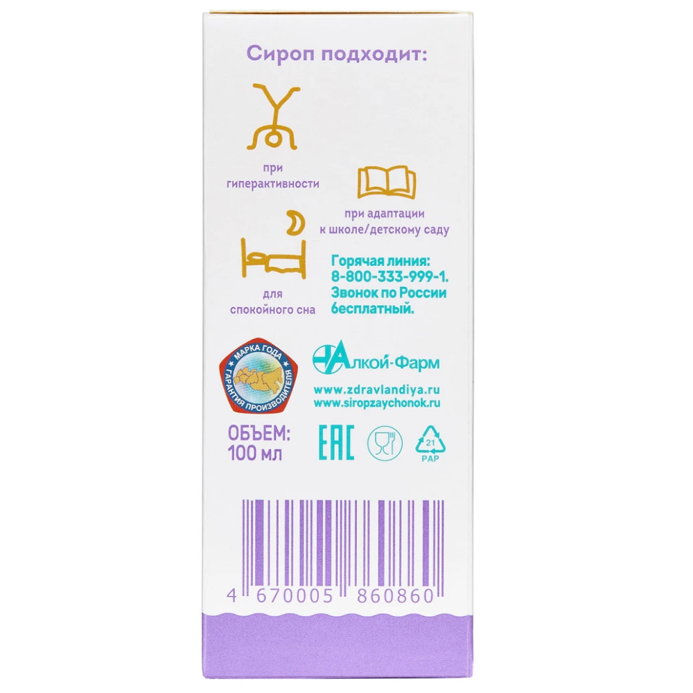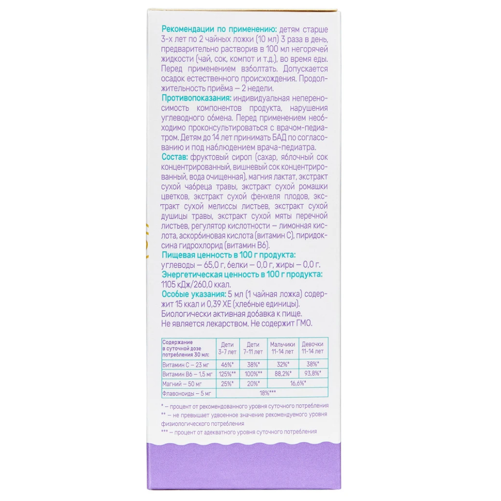 Магния лактат, витамин В6, экстракт сухой чабреца травы, экстракт сухой ромашки цветков, экстракт сухой фенхеля плодов, экстракт сухой мелиссы листьев, экстракт сухой душицы травы, экстракт сухой мяты перечной листьев, витамин С, фруктовый сироп (сахар, яблочно-вишневый сок).