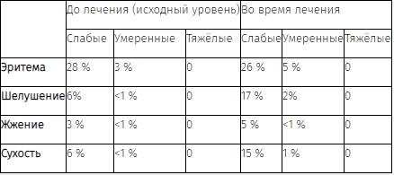 Во время первых недель лечения у большинства пациентов усиливается шелушение и покраснение кожи. В зависимости от тяжести данных побочных эффектов пациенты могут использовать увлажняющие средства, временно снизить частоту применения препарата, либо временно прекратить применение. Эффективность препарата при применении с частотой реже одного раза в день не изучалась.