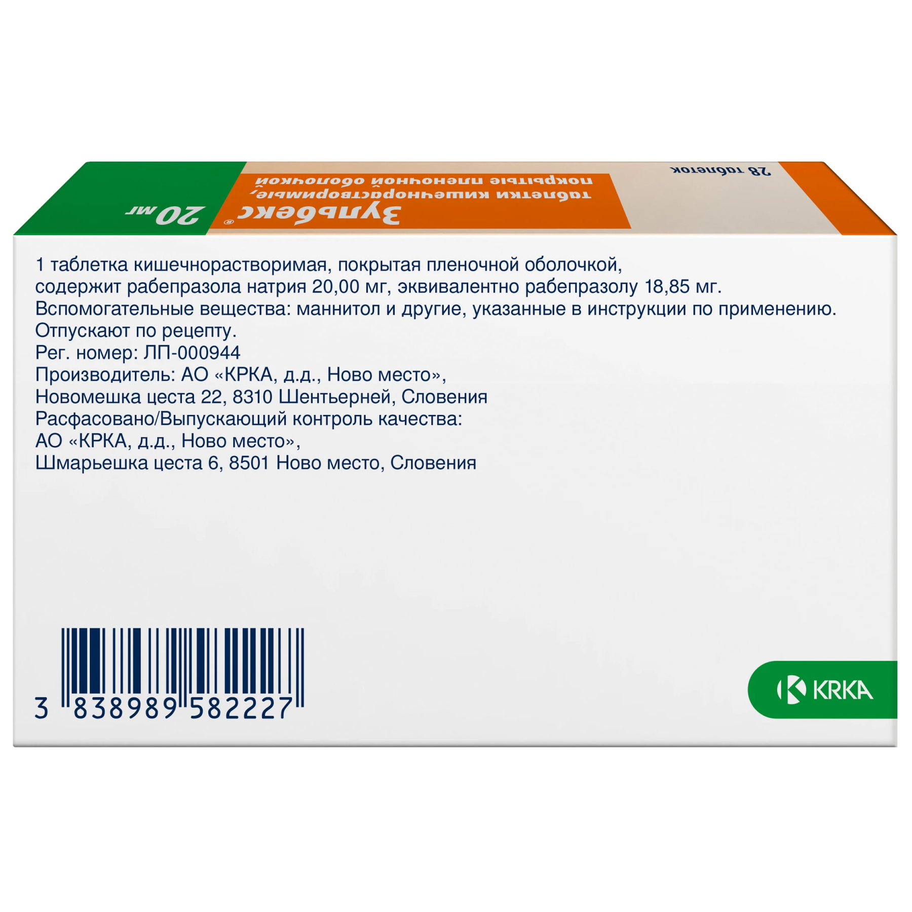 Активное вещество: рабепразол натрия 20 мг, что соответствует содержанию рабепразола 18.85 мг.
