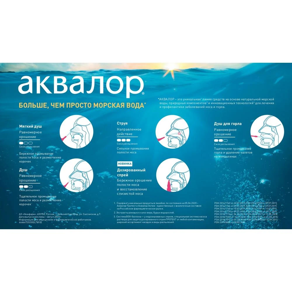 Препарат Аквалор используется для промывания, помогая уменьшить отек и увлажняя слизистую. Заложенность носа уменьшается, и дыхание становится свободнее. Средство оказывает регенерирующий эффект при воспалительном процессе, оказывает антисептическое свойство, снижает воспалительную реакцию. Мерцательный, или защитный эпителий усиливает работу своих клеток. Снижается продолжительность респираторного заболевания. Значительно снижается риск дальнейшего распространения инфекции (на околоносовые пазухи, уши).