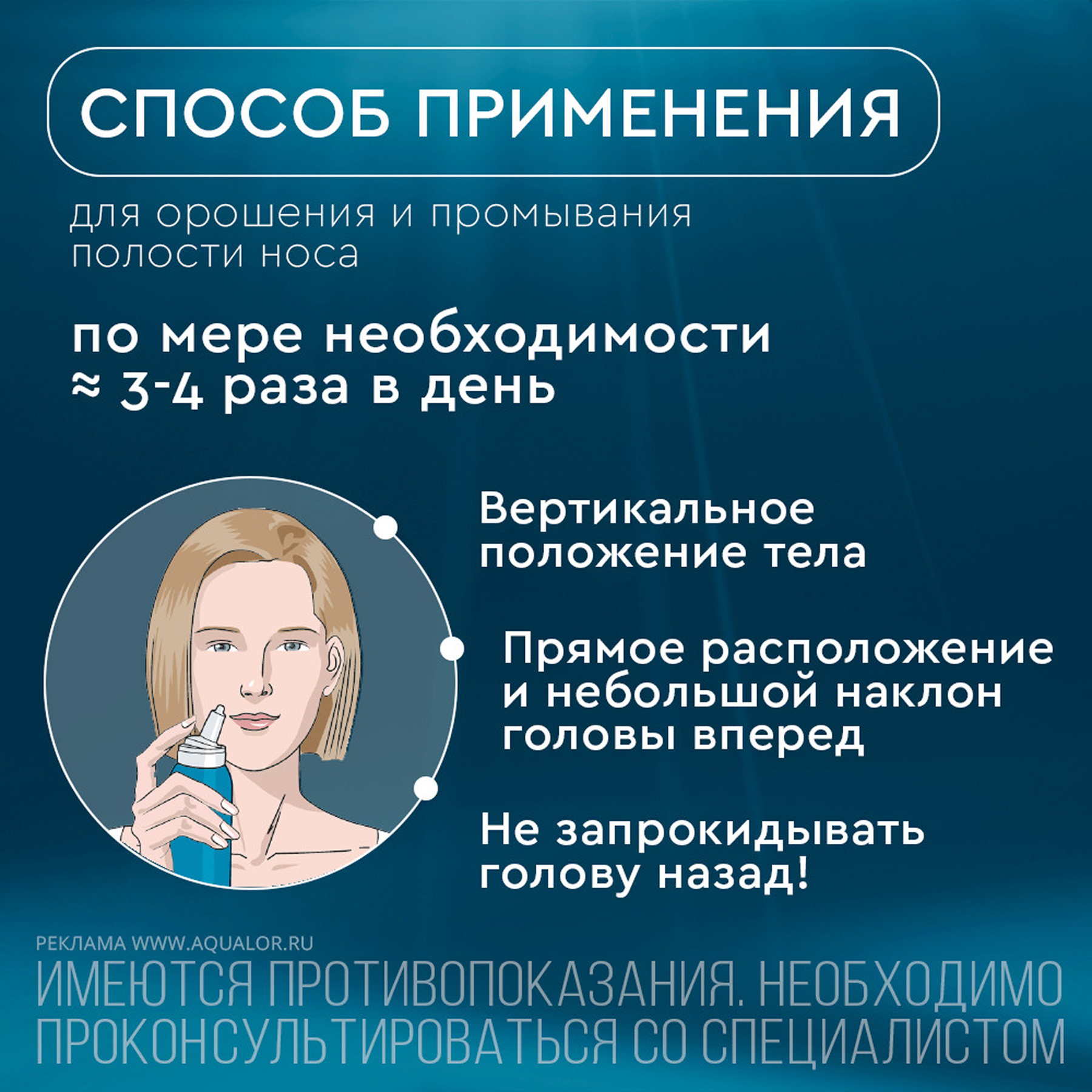 Средство Аквалор применяется индивидуально. После использования необходимо вымыть насадку с помощью теплой водой и мыла. Далее ополоснуть. Это проводится во избежание риска контаминации бактериями и вирусами.
