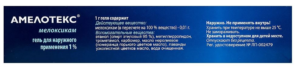 Гель Амелотекс применяется для наружного нанесения. Полоску геля длиной около 4 см (2 г) 2 раза/сут. тонким слоем и слегка втирают в течение 2-3 мин. Продолжительность курсового лечения варьируется в зависимости от полученного терапевтического эффекта, но не превышает 1 месяца.