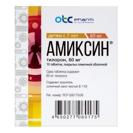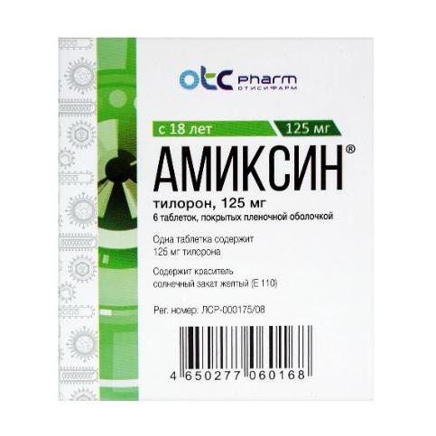 В зависимости от производителя таблетки расфасованы в пластиковые флаконы или блистеры из металлизированной фольги. Во вторичной упаковке — картонной коробке — находится и подробная инструкция по применению. Активный состав Амиксина представлен только одним компонентом тилороном. А для формирования основы таблеток и кишечнорастворимой оболочки производители воспользовались несколькими ингредиентами: