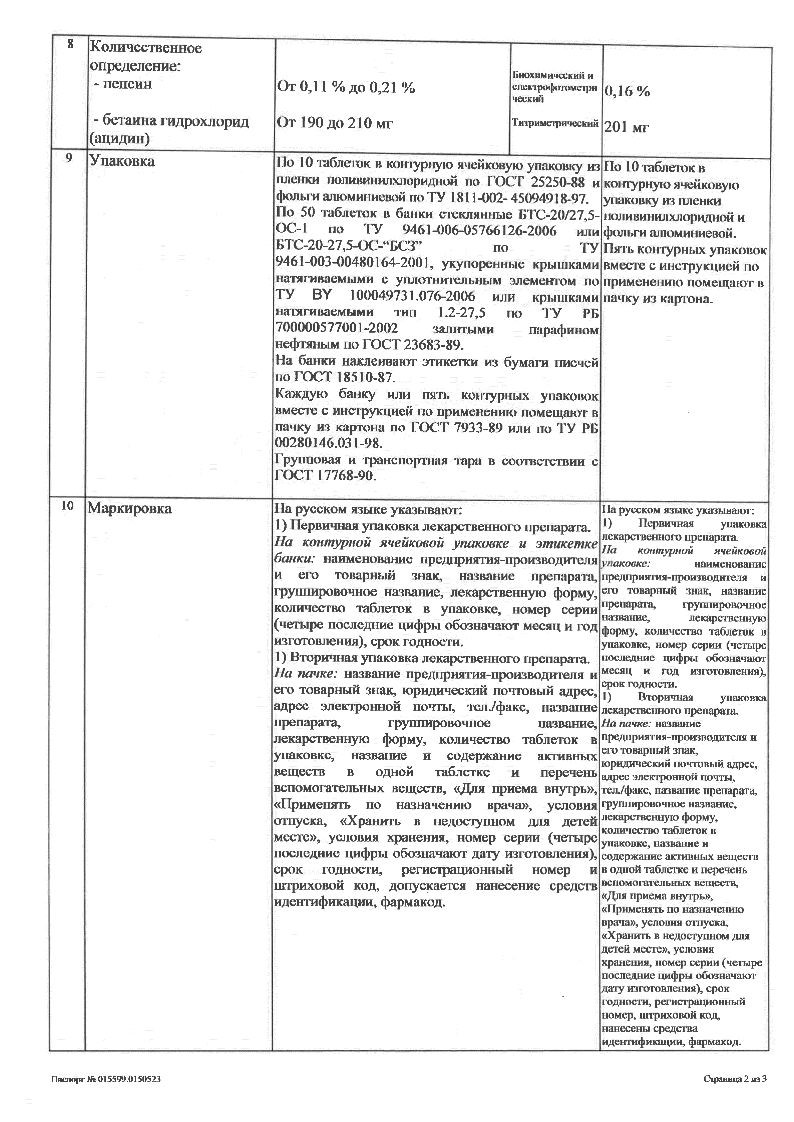 Препарат выпускается белорусской фармацевтической компанией Белмедпрепараты в виде белых или желтовато-белых плоскоцилиндрических таблеток с рисками и фасками, со специфическим запахом. Она расфасована в темные стеклянные флаконы с пластиковыми притертыми крышками. Вторичной упаковкой препарату служит картонная коробка, внутри которой находится подробная инструкция по применению.