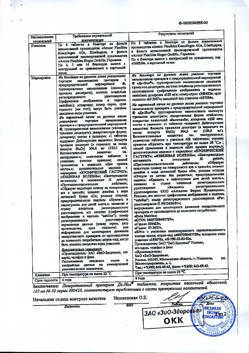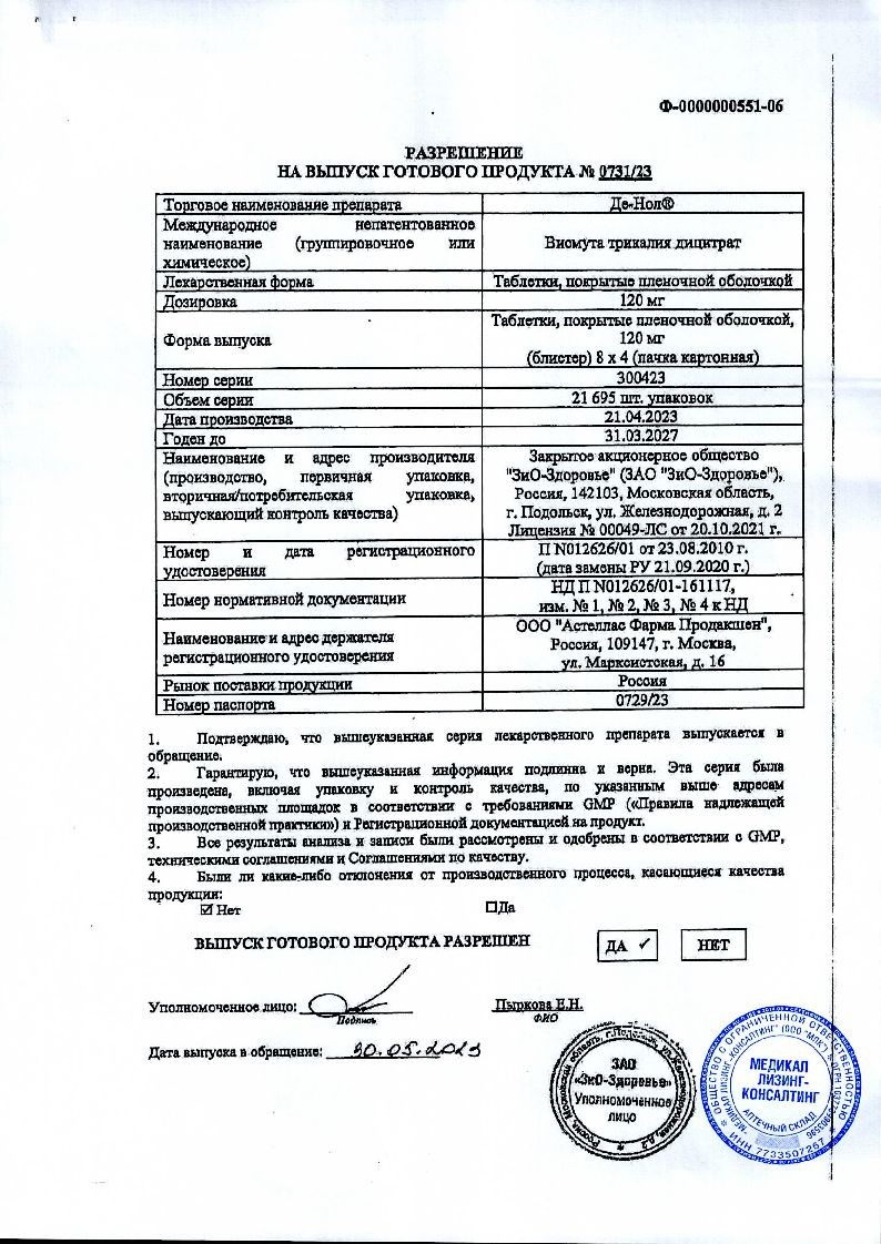 Висмута трикалия дицитратДе-Нол производится в Нидерландах фармацевтическим концерном Astellas Pharma Europe B.V. в форме круглых таблеток без посторонних включений со слабым специфическим запахом. Первичной упаковкой препарату служит блистер из металлизированной фольги. Таблетки вложены в картонные коробки вместе с подробной инструкцией по применению.