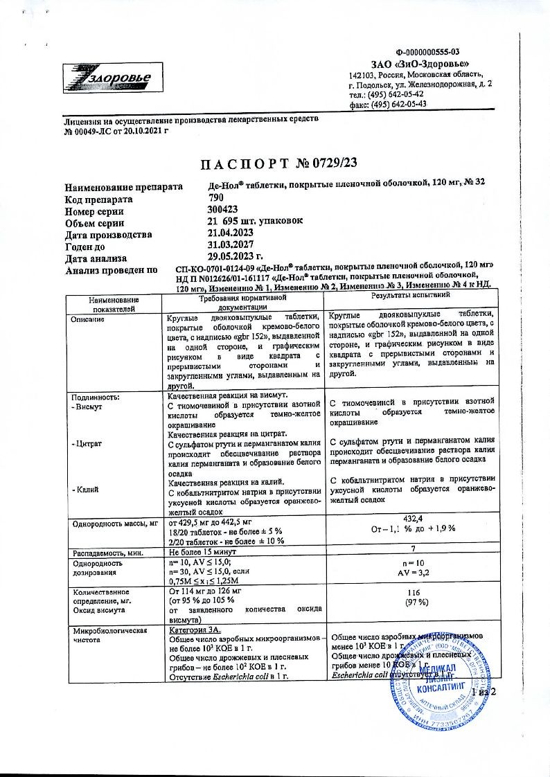 Срок годности лекарственного средства — 4 года. Его следует хранить при комнатной температуре в местах, защищенных от прямых солнечных лучей. Доступ маленьких детей к Де-Нолу должен быть ограничен. При изменении цвета таблеток использовать их для лечения нельзя.