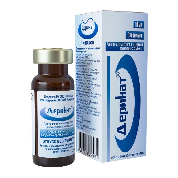 Деринат выпускается в форме капель и спрея для наружного и местного применения. Это прозрачный раствор без посторонних включений. Разливается в стеклянные флаконы, а также во флаконы с насадкой-распылителем и капельницы. Каждый упаковывается в картонную пачку с инструкцией по применению Дерината.