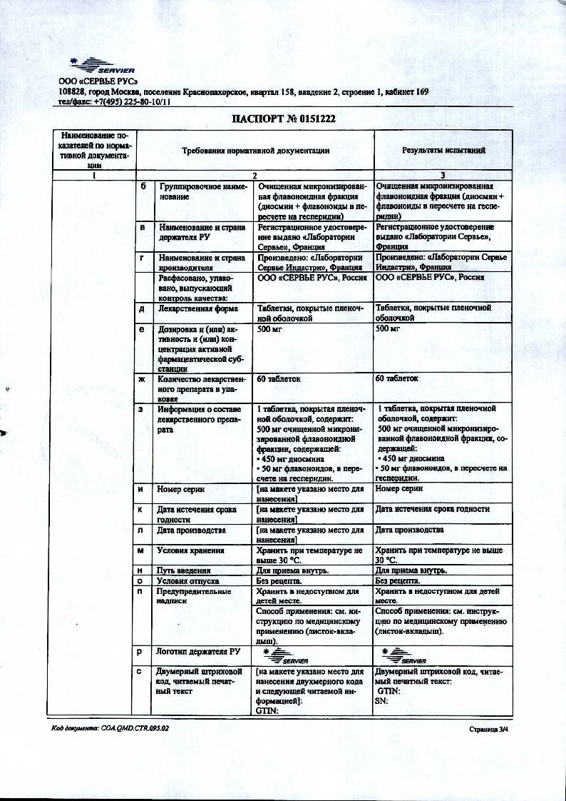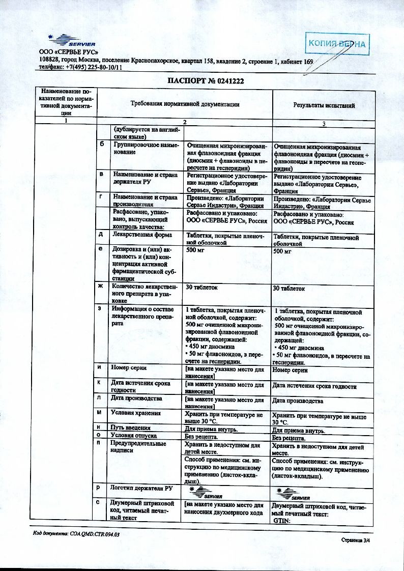 - очищенная микронизированная флавоноидная фракция – 1000 мг, в том числе диосмин – 900 мг;