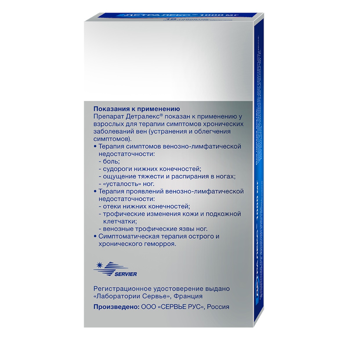Детралекс – современный медицинский препарат, разработанный специально для терапии вен и сосудов, в частности варикоза и геморроя. Способствует снятию болевых ощущений, отечности и тяжести в ногах при варикозном расширении вен, помогает устранить дискомфорт при геморрое, остановить кровотечение и уменьшить боль. Цена на Детралекс указана в карточке лекарства на сайте.
