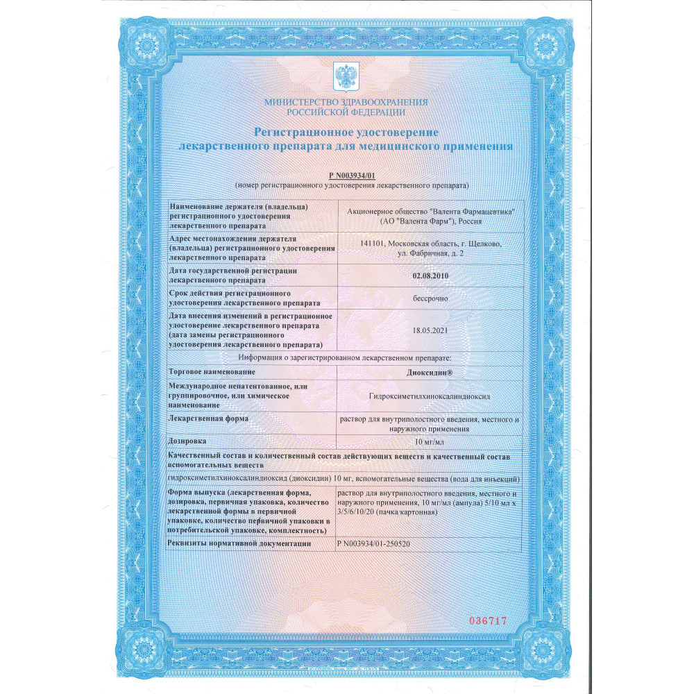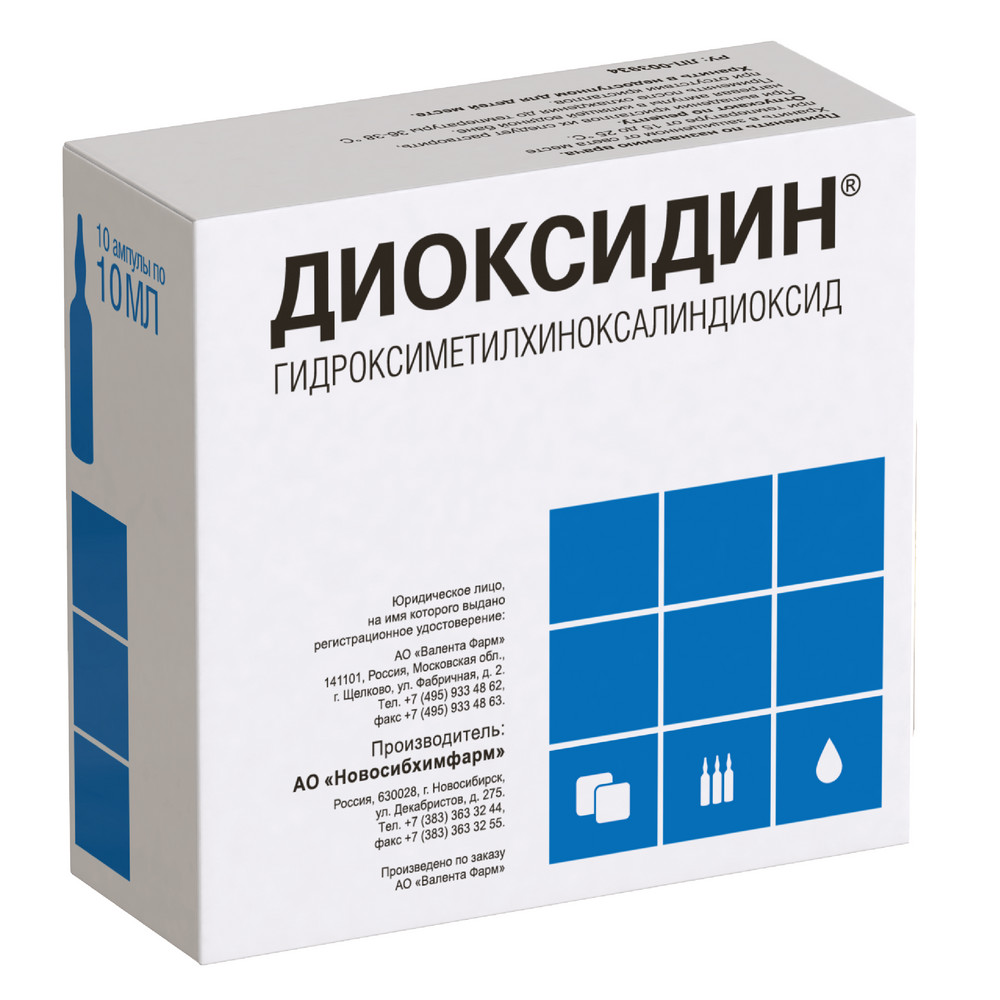 Производством Диоксидина занимаются многие отечественные фармацевтические фабрики. В лечении инфекционно-воспалительных заболеваний внутренних органов и кожи особенно востребован растворы для внутриполостного и внутривенного введения, наружного и местного применения. Они помещены в стеклянные или пластиковые флаконы, ампулы. Растворы прозрачные, без посторонних включений и запаха.