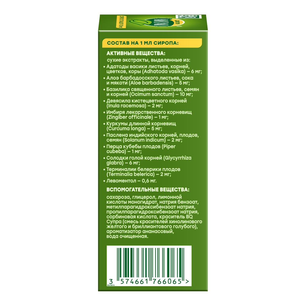 вспомогательные вещества: сахароза 750 мг, глицерол 50 мг, лимонной кислоты моногидрат 0,65 мг, натрия бензоат 3,5 мг, метилпарагидроксибензоат натрия 1 мг, пропилпарагидроксибензоат натрия 0,5 мг, сорбиновая кислота 0,5 мг, краситель BQ Cупра (смесь красителей хинолинового желтого и бриллиантового голубого) 0,6 мг, ароматизатор ананасовый 0,002 мл, вода очищенная до 1 мл.