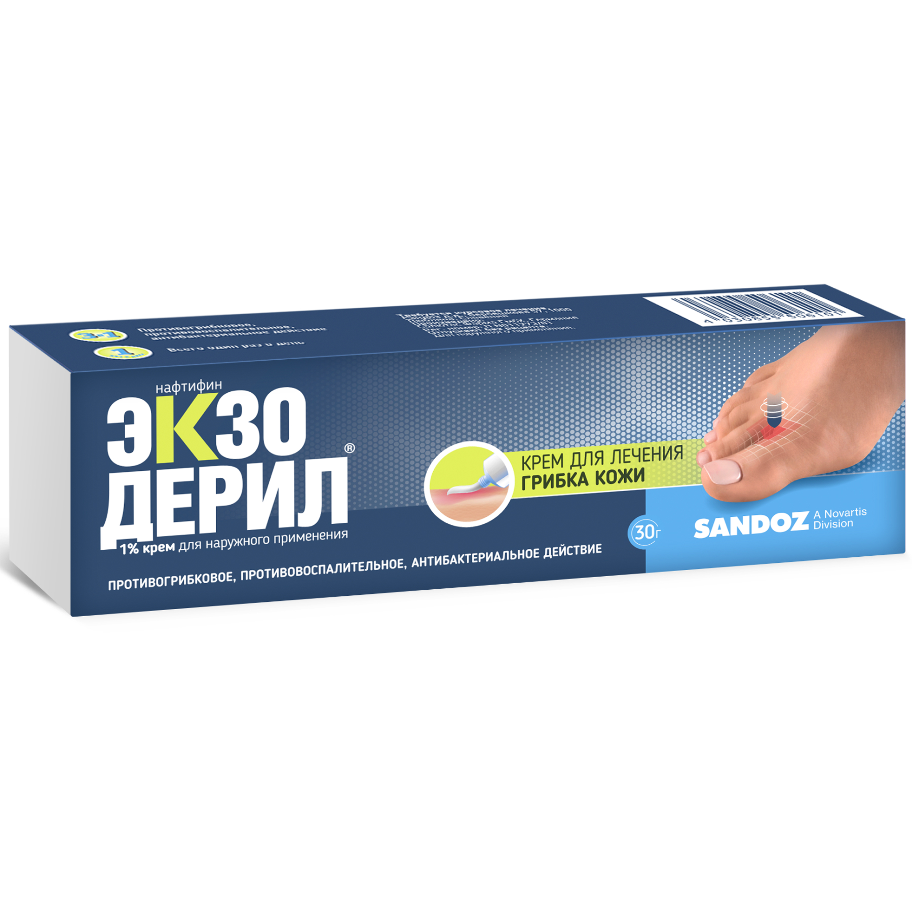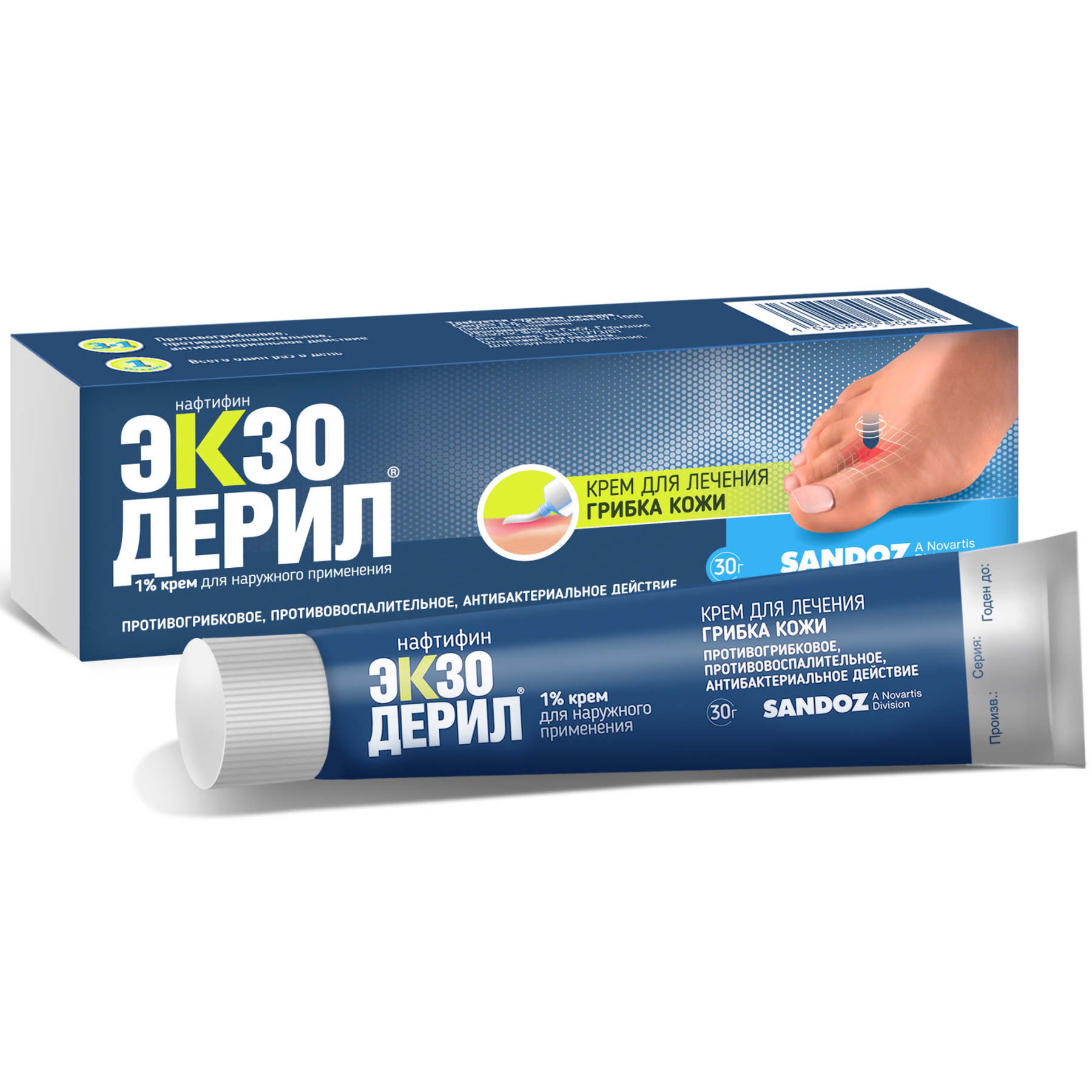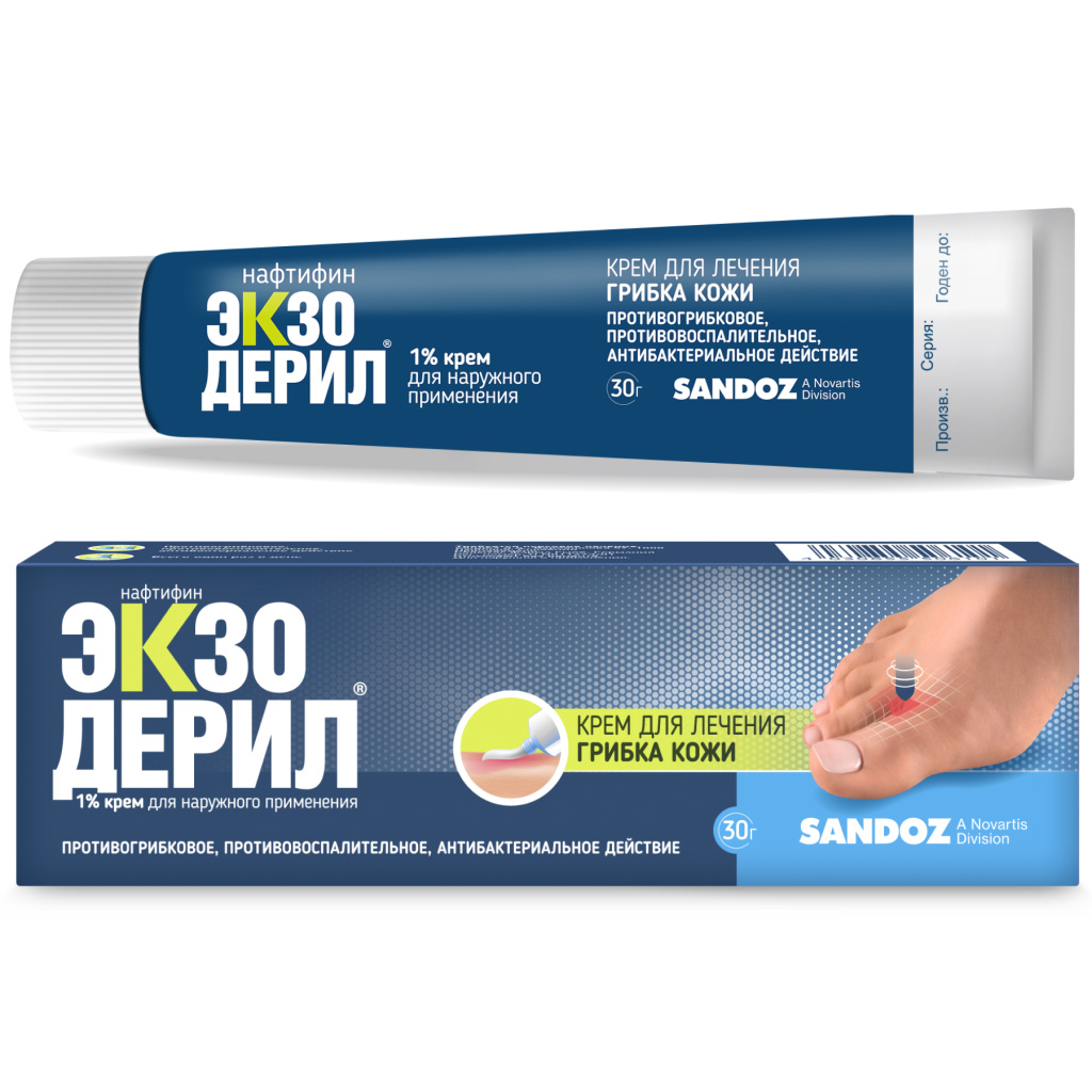 в виде белого крема, расфасованного в алюминиевые тубы. У него плотная консистенция и специфический «медицинский» запах. В лечебную линейку Экзодерил также входит прозрачный раствор во флаконах из темного стекла. Они оснащены встроенным приспособлением для отмеривания капель. И флаконы, и тубы помещены в картонные коробки вместе с инструкцией по применению.