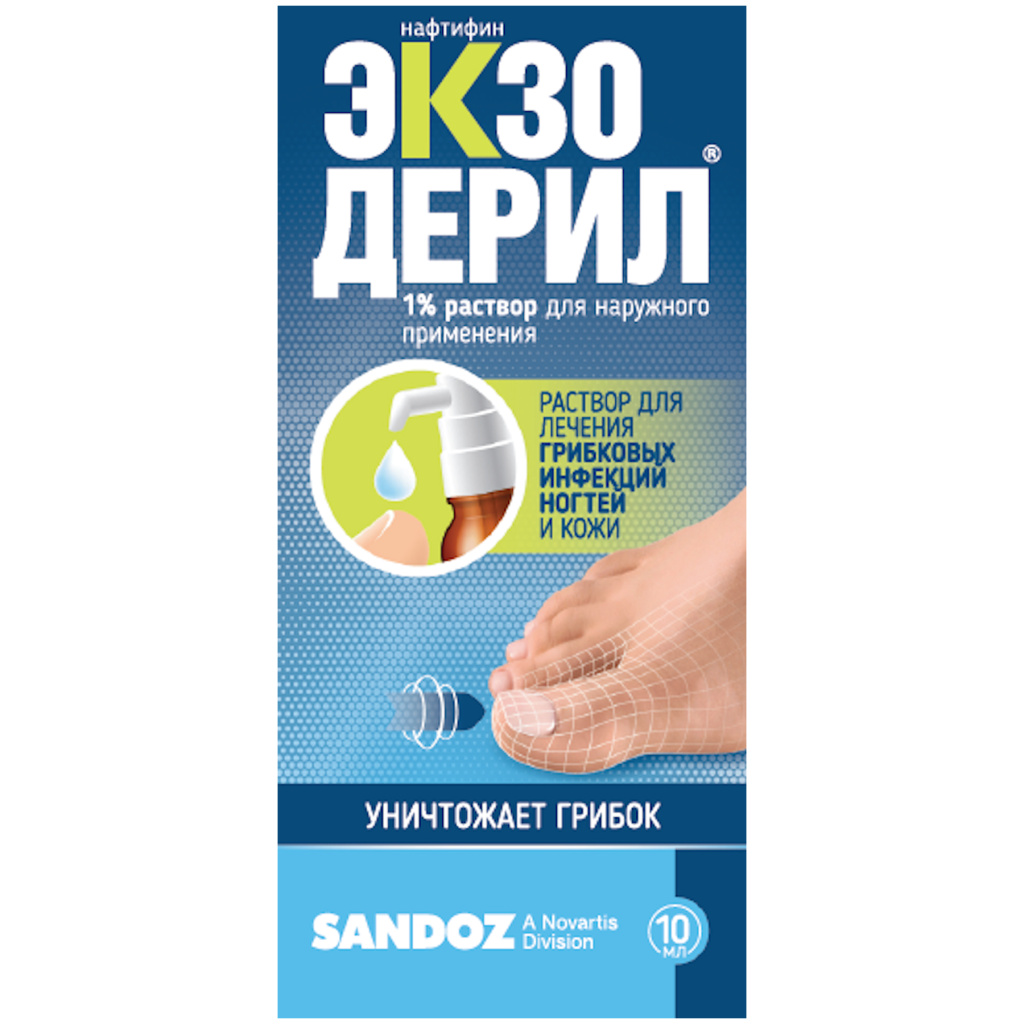 Экзодерил устраняет спровоцированную воспалением отечность, что приводит к исчезновению болезненных ощущений, зуда, жжения, которые обычно усиливаются при ходьбе. Ускоряется внутриклеточный метаболизм,запускаю регенерацию. К действию нафтифина чувствительно большинство известных возбудителей онихомикозов и микозов.