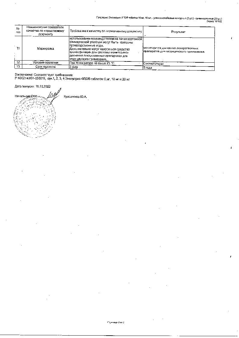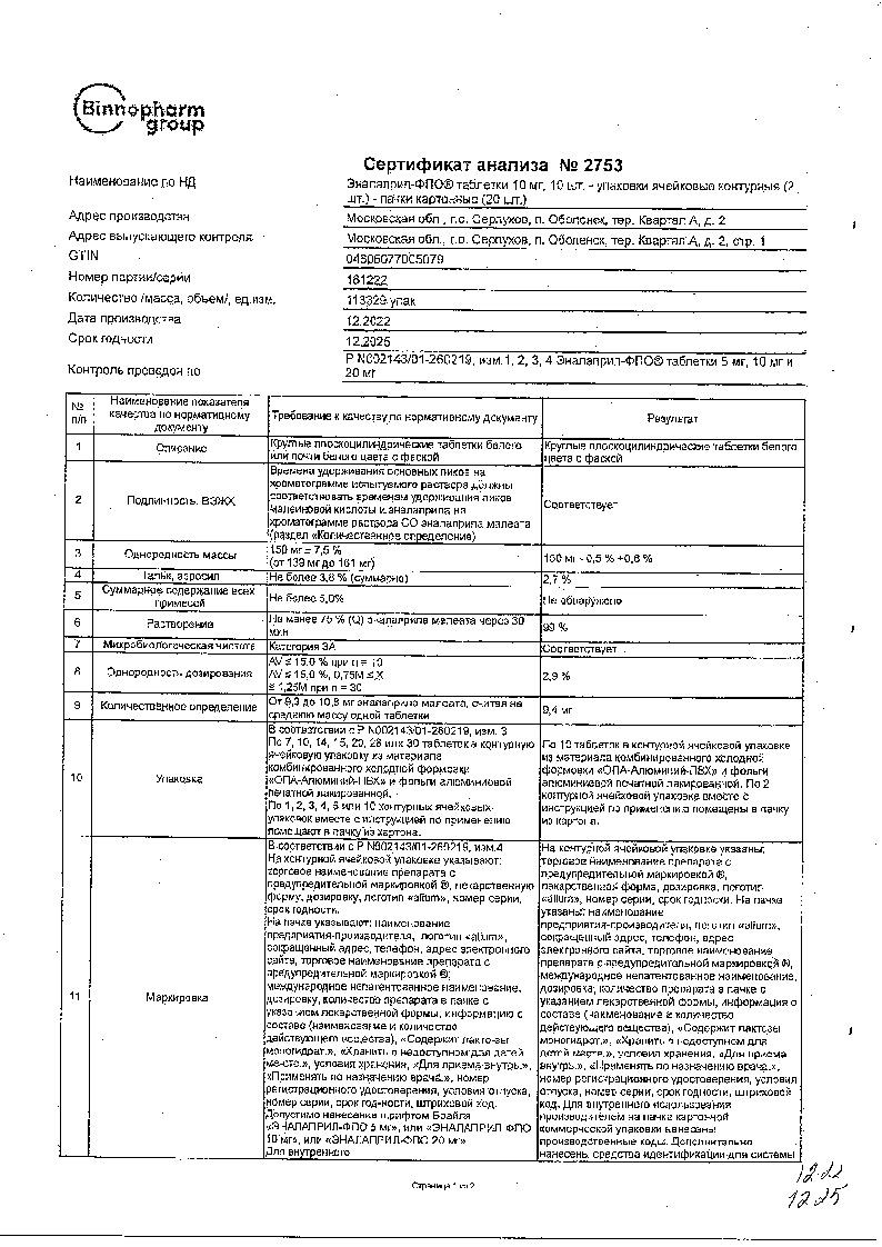 Активное действующее вещество лекарственного препарата – эналаприла малеат. Его количество может варьироваться от 2,5 до 20 мг в одной таблетке.