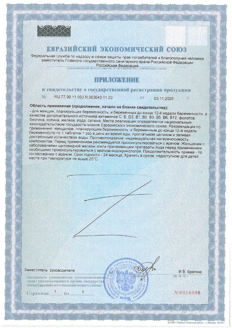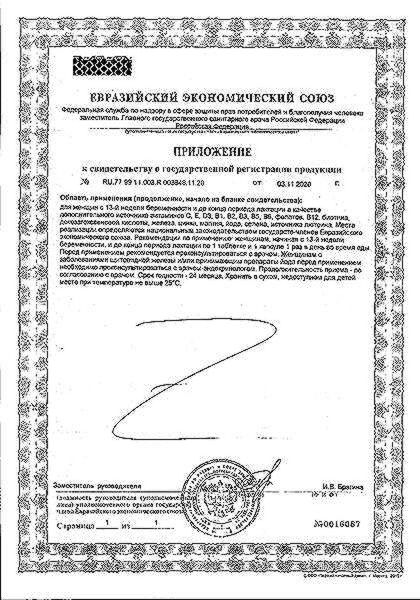 Активное вещество в составе - это фолиевая кислота. Этот элемент необходим для правильного формирования плода. В состав также входят витамины С, Е, D3, группы В, биотин, холин, железо, йод, селен.