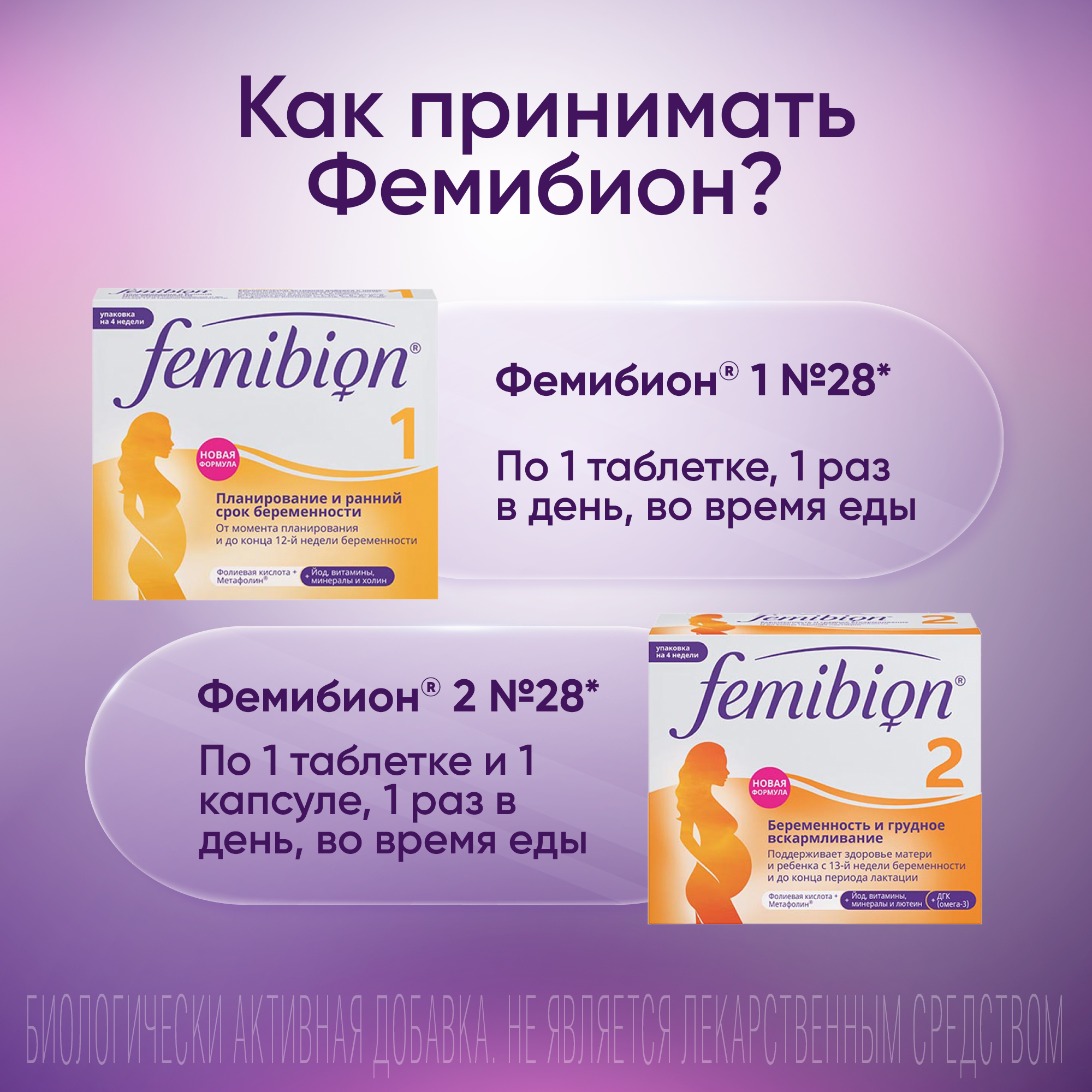 Согласно инструкции к Фемибион, его дозировка составляет одну таблетку в сутки. Препарат принимают до 12 недели беременности и на этапе ее планирования.