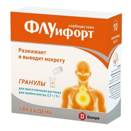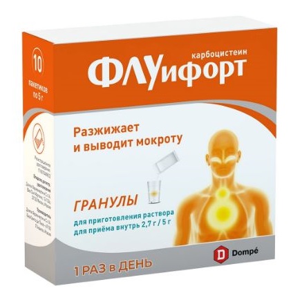 КарбоцистеинФлуифорт выпускается итальянской фармацевтической компанией DOMPE FARMACEUTICI в виде порошков, расфасованных в отдельные пакеты. После их разведения в горячей воде получается вкусный ароматный напиток, быстро справляющийся с кашлем и затрудненным дыханием. Активный состав препарата представлен только одним компонентом — карбоцистеином из клинико-фармакологической группы муколитических средств. А для формирования основы производитель воспользовался такими ингредиентами: