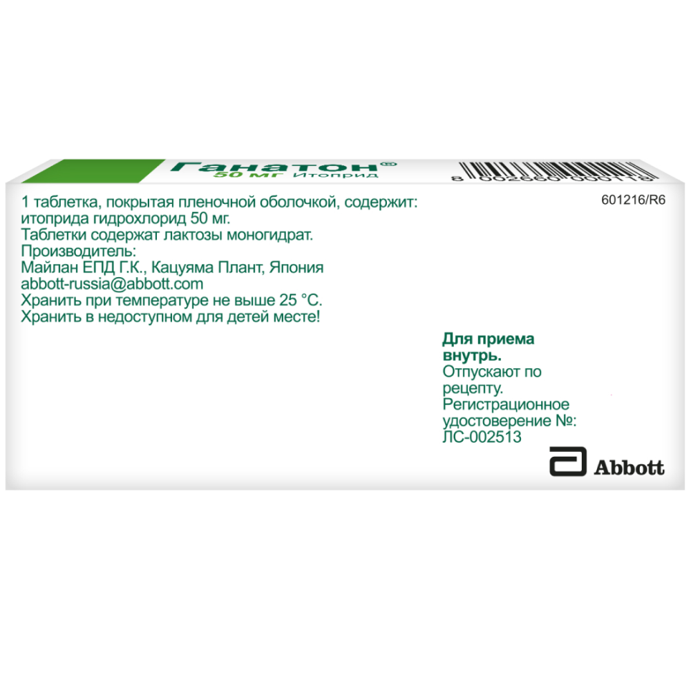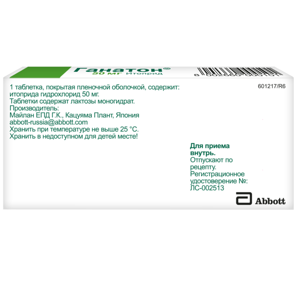 Ганатон (Ganaton) – лекарство, оказывающее стимулирующее воздействие на работу ЖКТ. Препарат назначают для лечения ЖКТ при появлении симптомов, связанных с нарушением моторики и замедленным опорожнением. Предназначен для приема внутрь. Врач может назначать при хроническом гастрите, функциональной диспепсии и расстройстве пищеварения. Выпускается в виде таблеток, в состав которых входит 50 мг итоприда. Продается в картонных упаковках по 10, 40 и 70 штук.