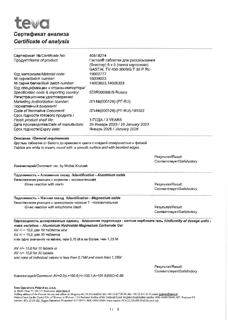 Гастал производится польской фармацевтической компанией TEVA. Лекарственное средство выпускается в форме белых крупных таблеток для рассасывания, зернистых на изломе. Расфасованы они в контурные ячейки блистеров, вложены в картонную коробку вместе инструкцией по применению.