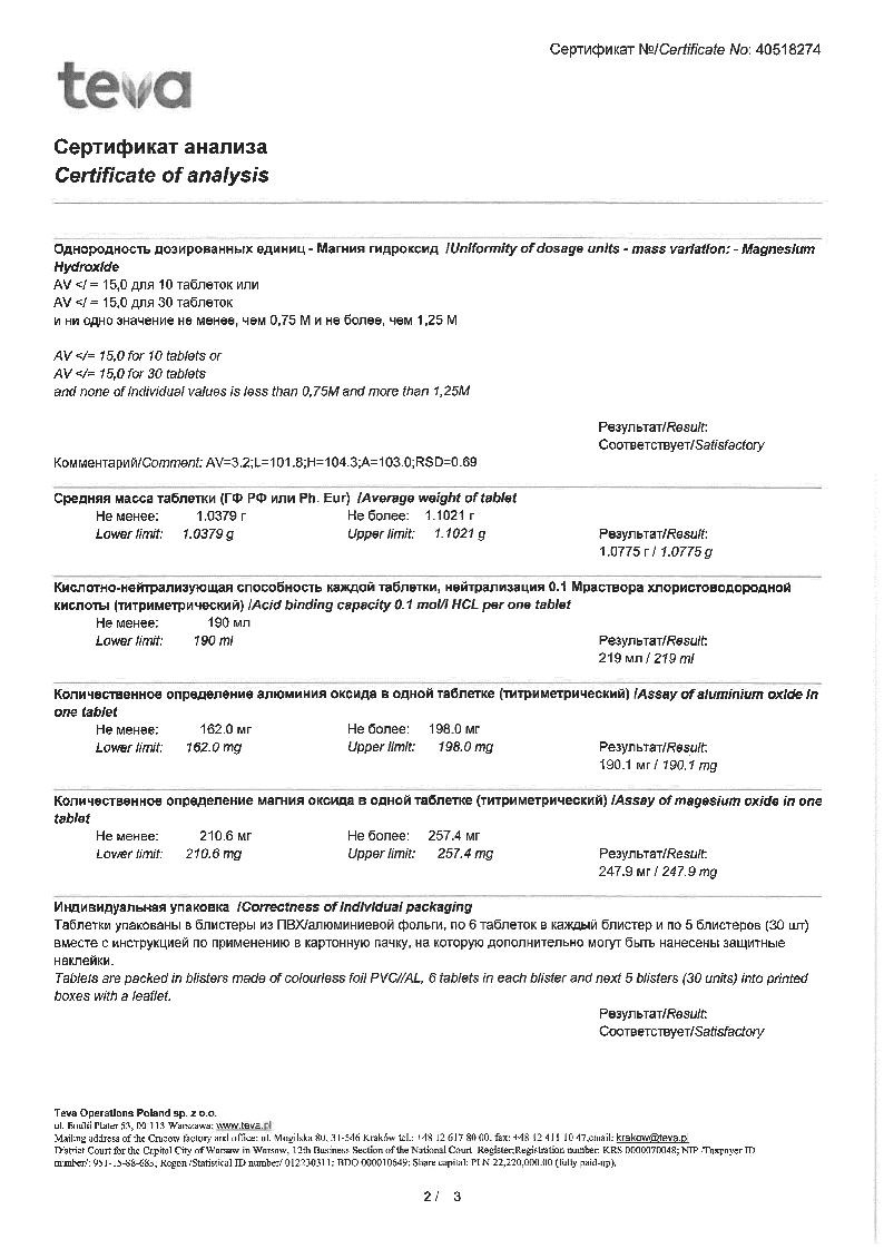 Для формирования активного состава производитель воспользовался алюминия гидроксида-магния карбонатом в гелеобразной форме и магния гидроксидом из клинико-фармакологической группы антацидных средств. Вспомогательный состав таблеток с разнообразными вкусами представлен такими веществами: