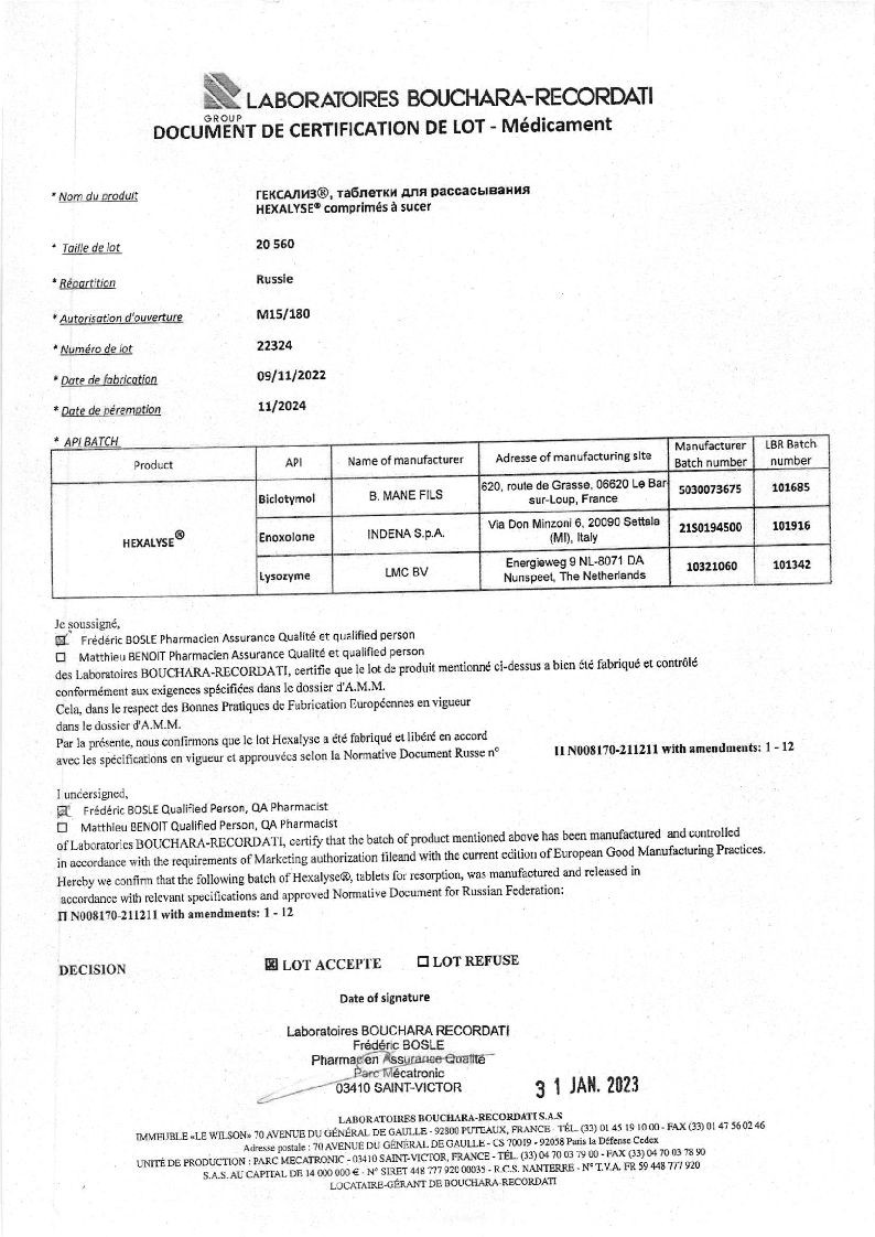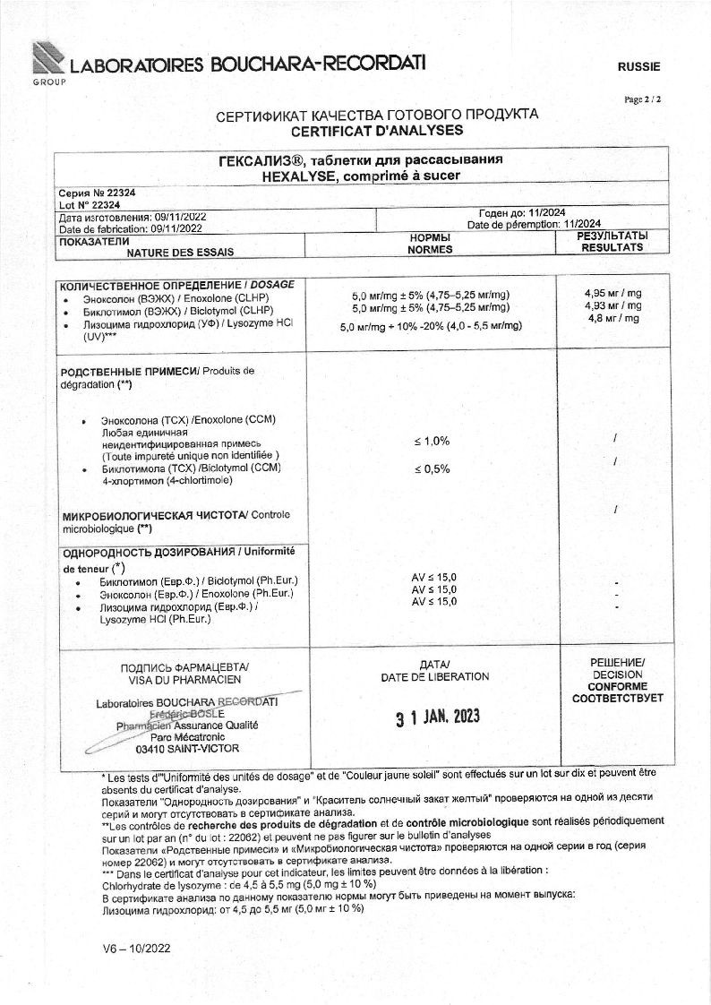 Биклотимол. Местный антисептик с антибактериальным действием, основанным на коагуляции белков микробных клеток. К нему не выработали резистентности (устойчивости) Staphylococcus spp, Streptococcus spp, Corynebacterium spp. Биклотимол проявляет также выраженную местноанестезирующую и противовоспалительную активность. В слизистые оболочки полости рта он всасывается медленно, чем и объясняется длительный терапевтический эффект Гексализа.