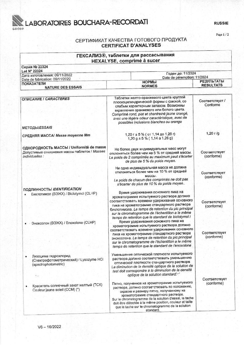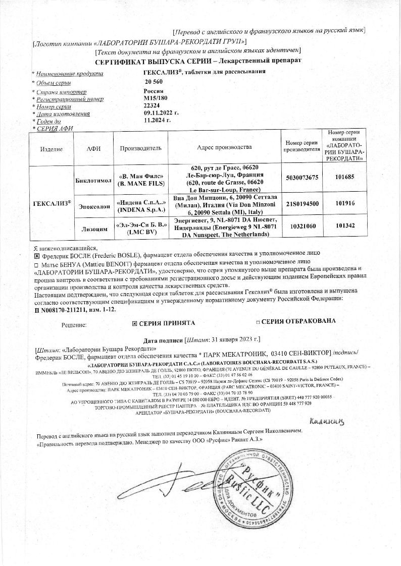 Гексализ производится французской фармацевтической компанией Laboratoires Bouchara-Recordati в виде таблеток, предназначенных для рассасывания. Они круглые, плоскоцилиндрические, оранжево-желтые, со скошенными краями. На изломе таблетки неоднородные, с белыми и оранжевыми включениями. От них исходит своеобразный приятный запах, усиливающийся при рассасывании. Первичной упаковкой Гексализа являются металлизированные блистеры, вторичной — плоская картонная коробка с подробной инструкцией по применению.