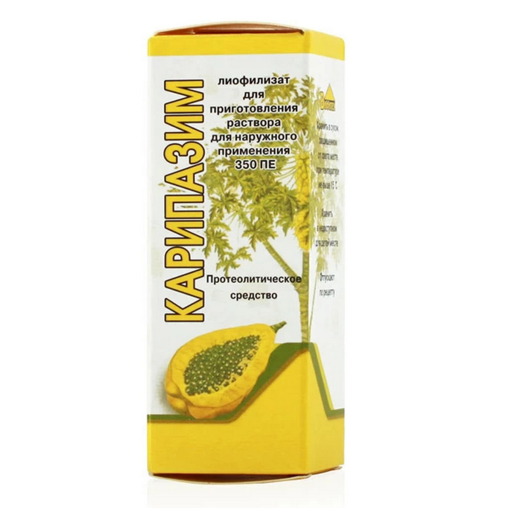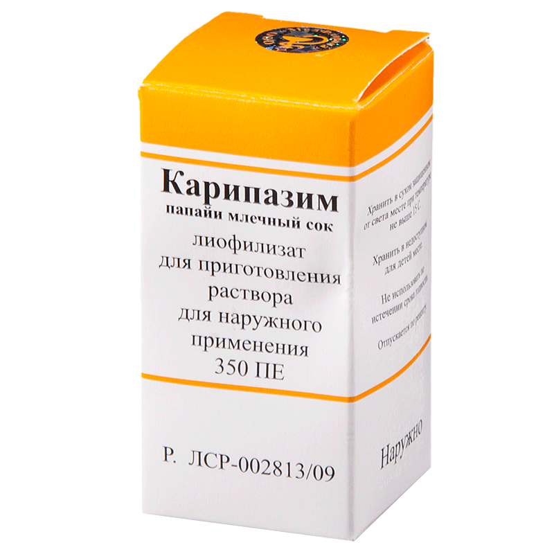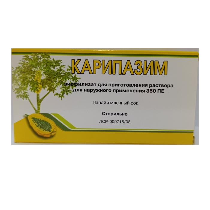 Активный состав препарата представлен высушенным млечным соком папайи с ферментами папаином, химопапаинами, пептидазами, лизоцимом. Вспомогательных компонентов лиофилизат не содержит. Фармацевтическая компания Медфлорина выпускает Карипазим в виде белого густого крема и нежного геля в пластмассовых банках с закручивающимися крышками. Их составы сформированы из таких активных веществ: