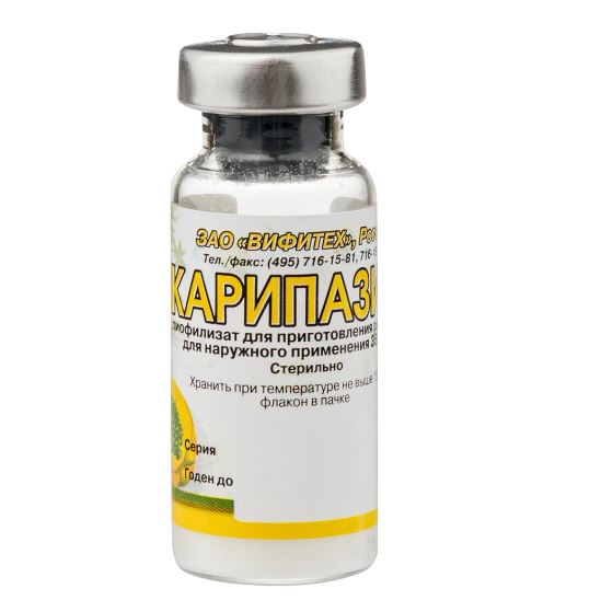 Срок годности фармакологического средства варьируется от полутора до двух лет в зависимости от лекарственной формы. Хранить его следует при комнатной температуре в темном месте (гель, крем) или в холодильнике (лиофилизат). Замораживания Карипазима допускать нельзя. Растворы хранению не подлежат — их необходимо использовать сразу после приготовления. К Карипазиму не должны иметь доступа маленькие дети.