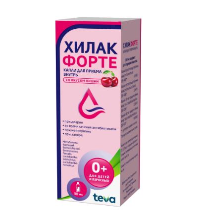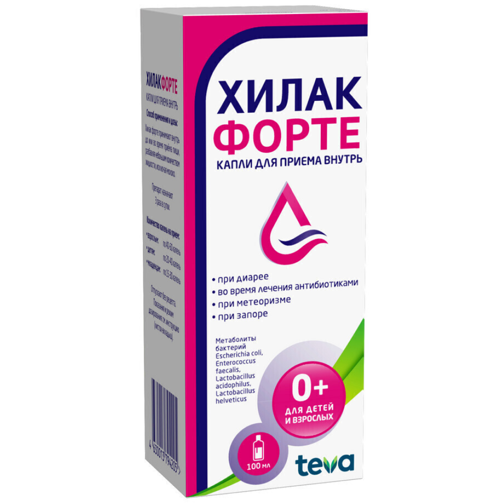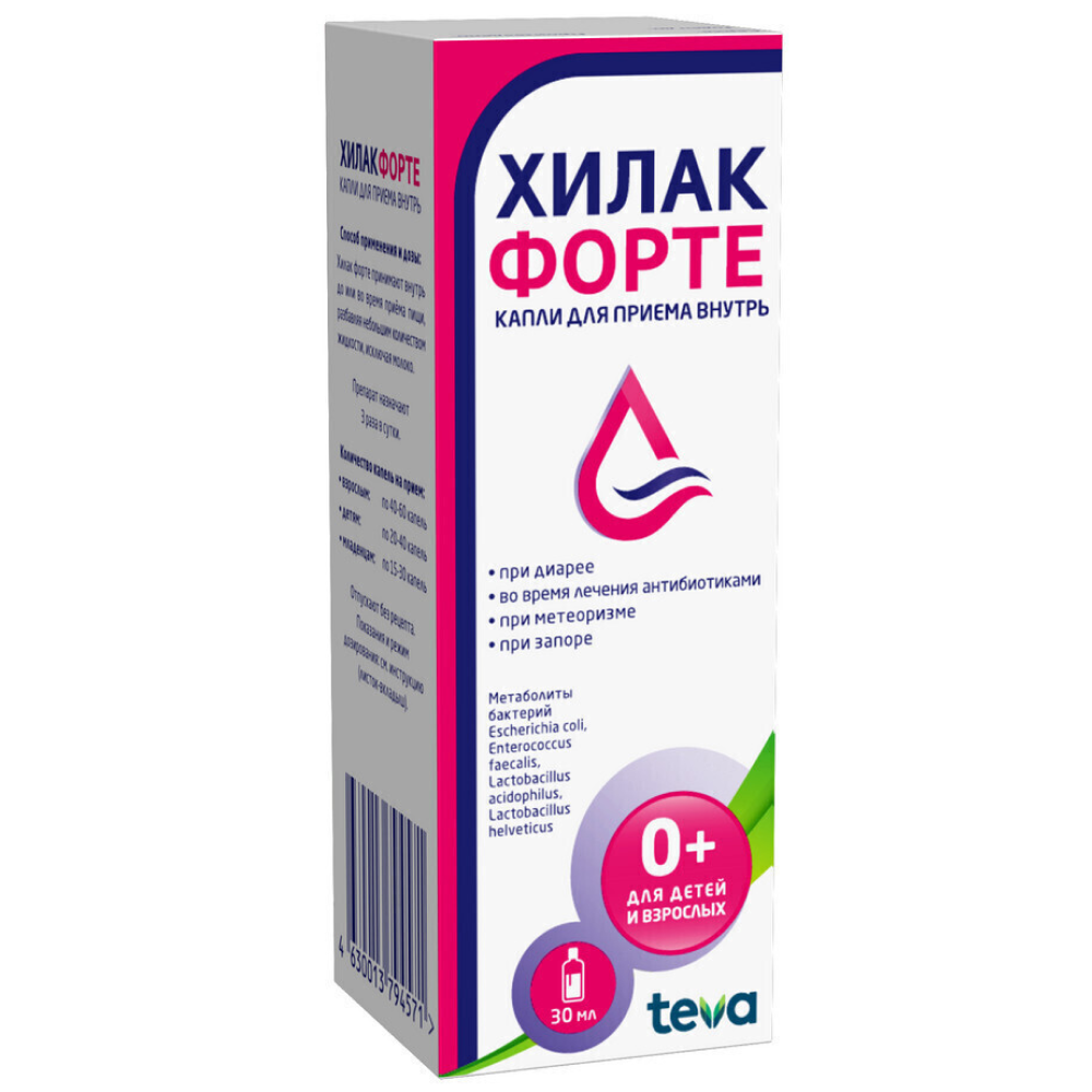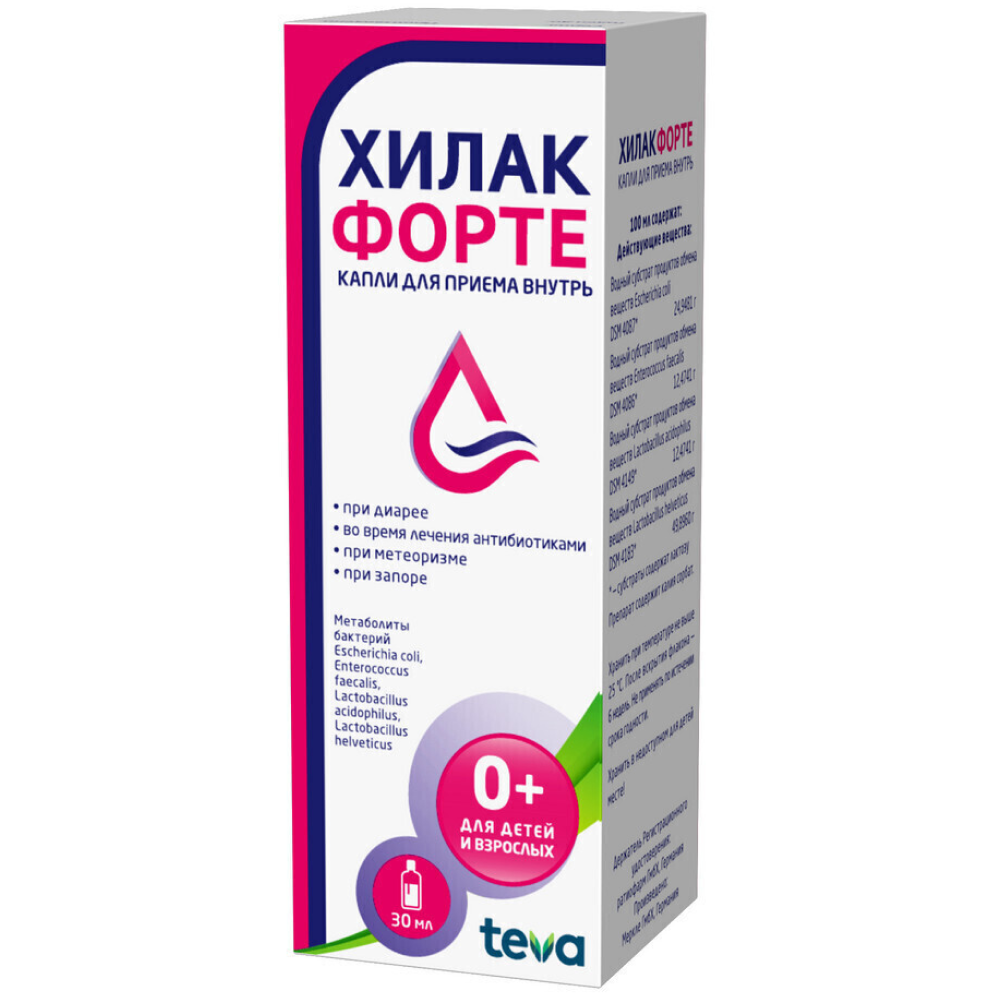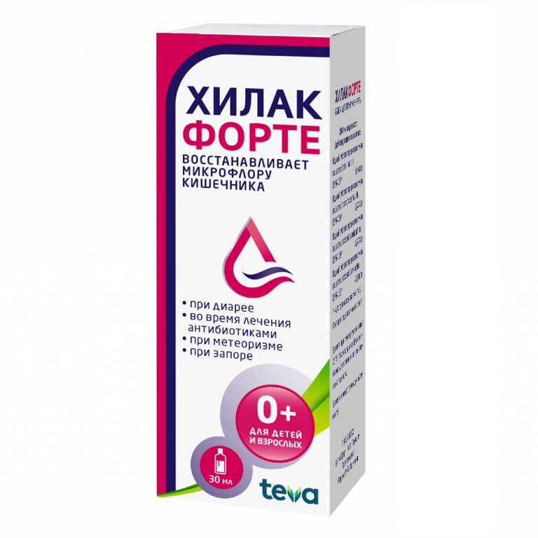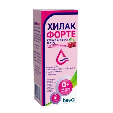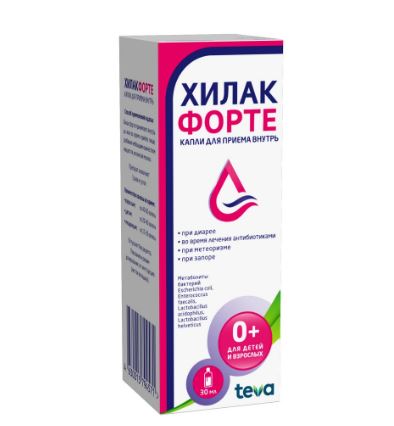 Метаболиты бактерий Эшерихия коли+Энтерококк фекальный+Лактобакт ацидофильные+Лактобакт хелветикус, Метаболиты бактерий Эшерихия коли, Энтерококк фекальный, Лактобакт ацидофильные, Лактобакт хелветикусНемецкий производитель Merckle выпускает Хилак форте только в жидкой лекарственной форме. Раствор очень популярен в лечении осложненных дисбактериозом заболеваний. Он вязкий, прозрачный, светло-коричневый или желтоватый, со специфическим запахом. Первичная упаковка — флакон из темного стекла со встроенной пипеткой-дозатором или отдельные саше. Они вложены в картонную коробку вместе с инструкцией по применению.