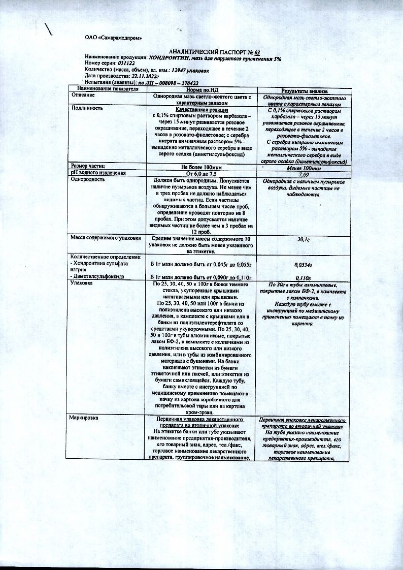 Эти компоненты добавлены для более быстрого всасывания в кожные покровы хондроитина. А также для его равномерного распределения в воспалительных очагах. В терапевтическую линейку Хондроитин включен бесцветный прозрачный желеобразный гель с приятным запахом. Помимо хондроитина его состав представлен такими компонентами: