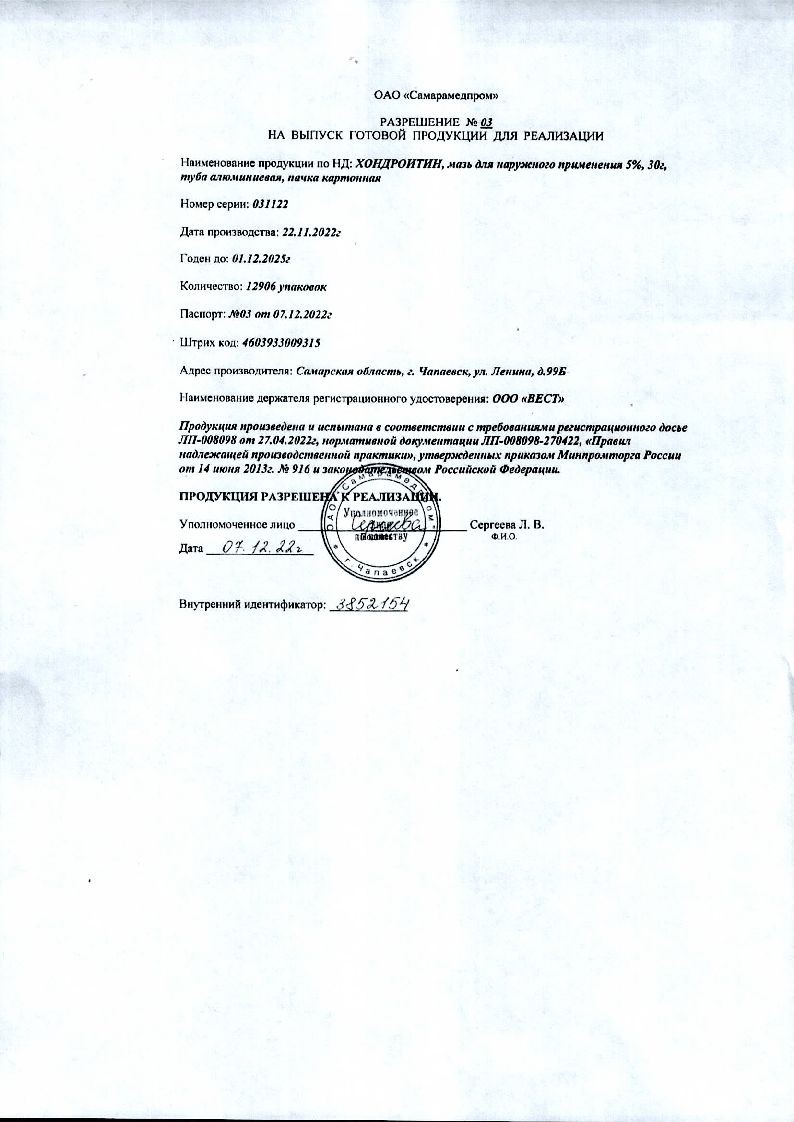 Хондроитин выпускается отечественным производителем Вертекс. Приобрести его можно в форме мази — густой, желтоватой, со специфическим запахом. Расфасована она в тубу с навинчивающимся колпачком. Активный состав наружного средства представлен только хондроитина сульфатом из клинико-фармакологической группы хондропротекторов. Для формирования мазевой основы производитель пользуется такими веществами:
