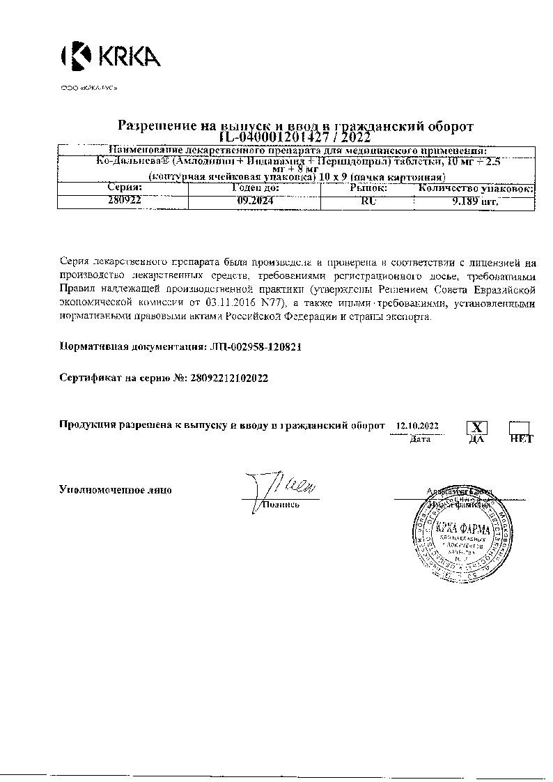 Получить дополнительную информацию можно в инструкции от производителя, присутствующей в каждой упаковке. Запрещается использовать Ко-Дальнева без назначения доктора. Даже если ранее употреблялись монопрепараты с идентичными главными компонентами в аналогичных дозировках.