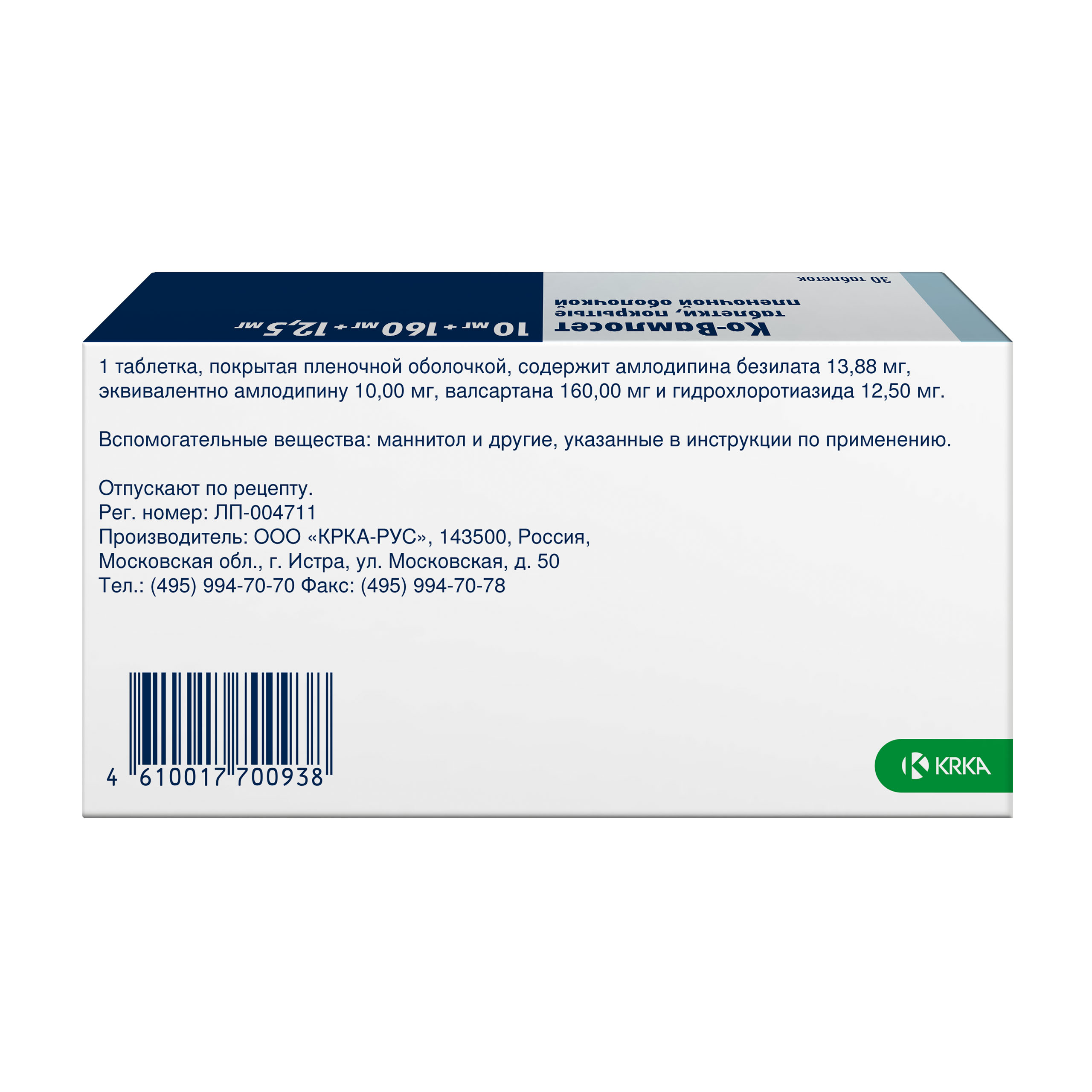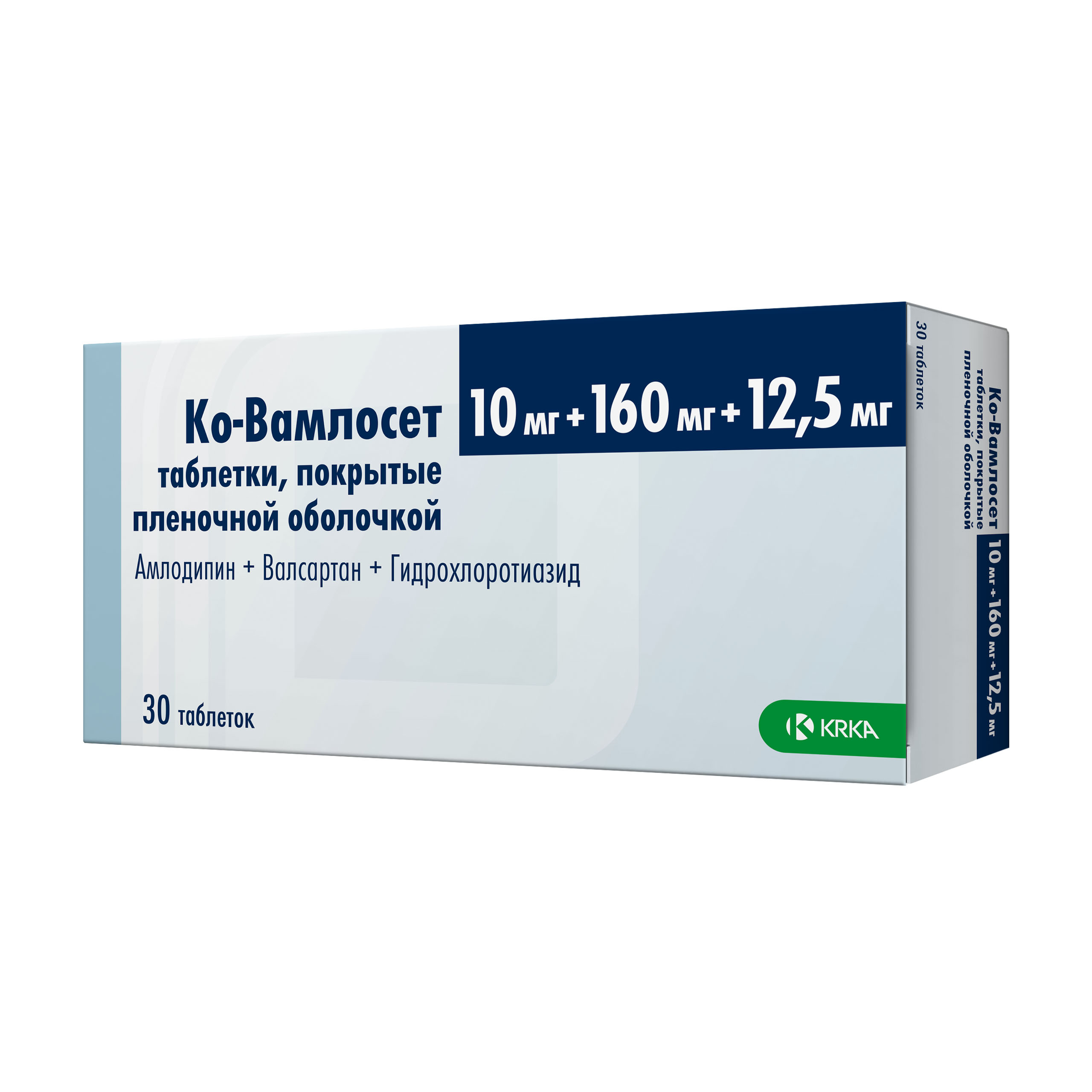 Ко-вамлосет выпускается в виде таблеток. В каждой присутствуют активные вещества амлодипин+валсартан+гидрохлоротиазид. Дозировка амлодипина может быть 5 мг или 10 мг, доза валсартана не меняется – 160 мг, доза ГХТЗ может быть 12,5 мг или 25 мг. Доступны следующие комбинации активных компонентов (амлодипин+гидрохлоротиазид+валсартан соответственно):