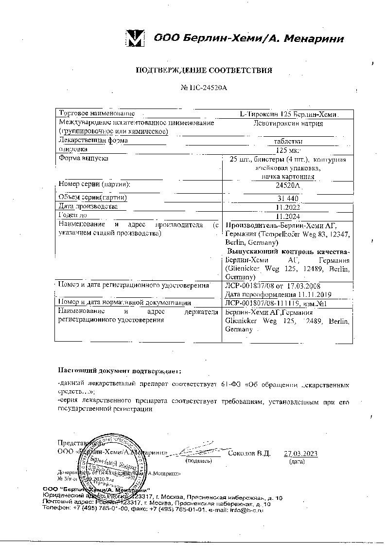 После приема внутрь левотироксин натрия практически до 93% от принятой дозы всасывается в системный кровоток преимущественно в верхнем отделе кишечника. Быстро всасывается, частично метаболизируется в печени на вещество (трийодтиронин), оказывающее непосредственное влияние на развитие и рост тканей организма, обменные процессы. Прием пищи снижает скорость всасывания. Максимальной концентрации в плазме крови достигает через 5-6 часов. Хорошо связывается с белками крови.