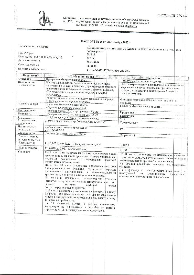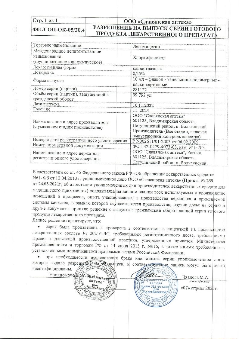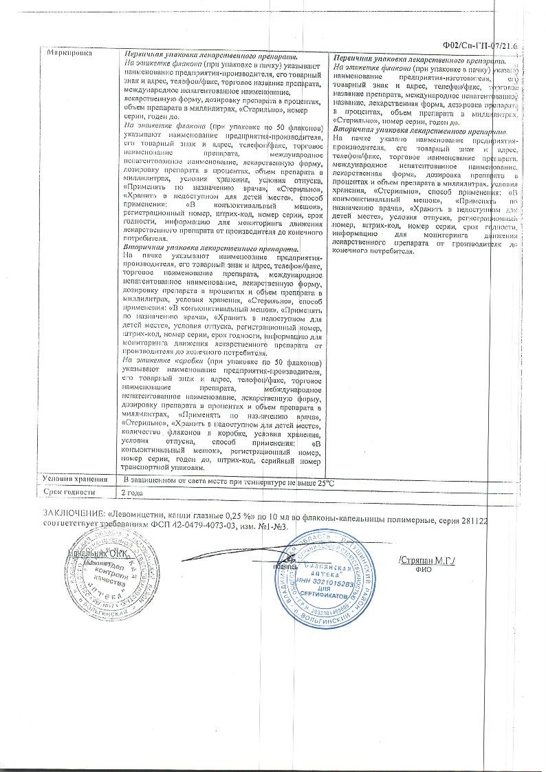 Левомицетин глазные капли содержат основное действующее вещество хлорамфеникол - 2,5 мг.