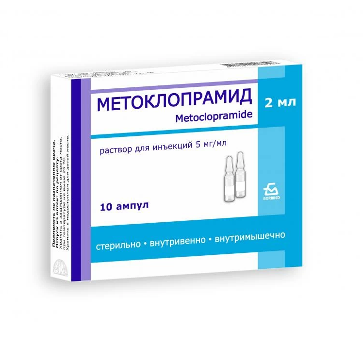 В лечебную линейку Метоклопрамид включен и раствор для инъекций. Прозрачная жидкость без посторонних включений расфасована в стеклянные или пластиковые ампулы. Терапевтическое действие раствора определяет метоклопрамид. А вспомогательный состав представлен такими компонентами: