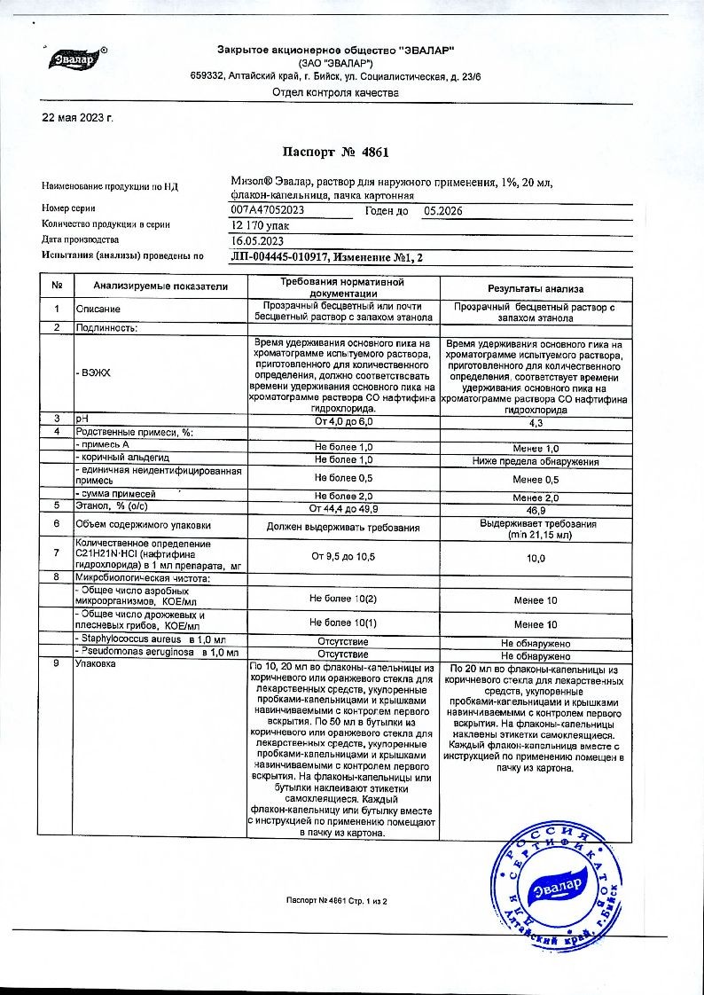Мизол выпускается в форме раствора для наружного применения. Жидкость бесцветная, со специфическим запахом этанола. Упаковывается во флаконы-капельницы по 10 и 20 мл или в бутылки – по 50 мл. Укладывается в картонные пачки с инструкцией по применению Мизола. Цена на Мизол указана в карточке товара.