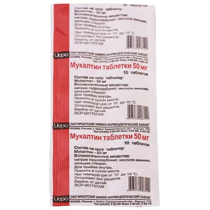 Экстракт корня алтея, Алтея лекарственного корней экстракт, Экстракт травы алтея, Алтея лекарственного экстрактМукалтин производится на многих отечественных фармацевтических фабриках в виде мелких бежево-серых таблеток с приятным сладковатым вкусом. Расфасованы они в блистеры из алюминизированной фольги, бумажные конвалюты или пластиковые флаконы. Вторичная упаковка — картонная коробка с вложенной внутрь подробной инструкцией по применению.