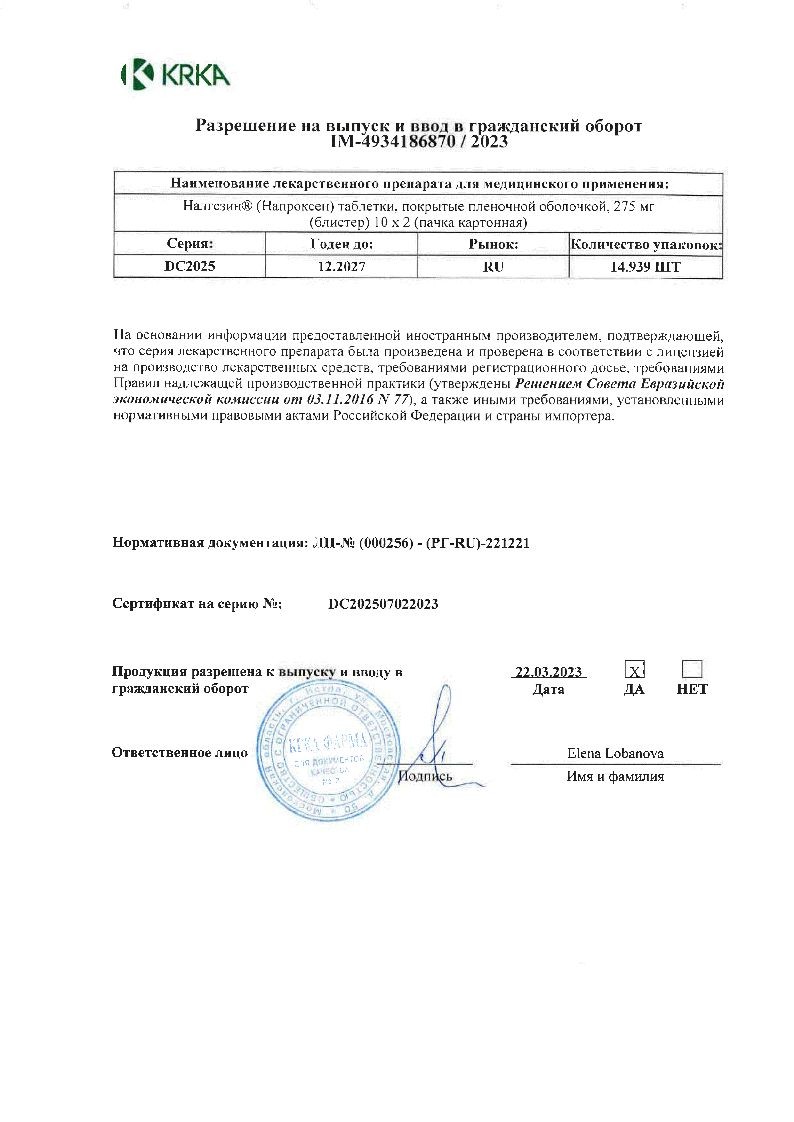 НапроксенЛекарственная форма препарата представлена овальными двояковыпуклыми таблетками, имеющими риску на одной стороне. Покрыты пленочной оболочкой синего цвета. Внешний вид характеризуется шероховатой массой белого цвета, под которой находится пленочная оболочка синего цвета.