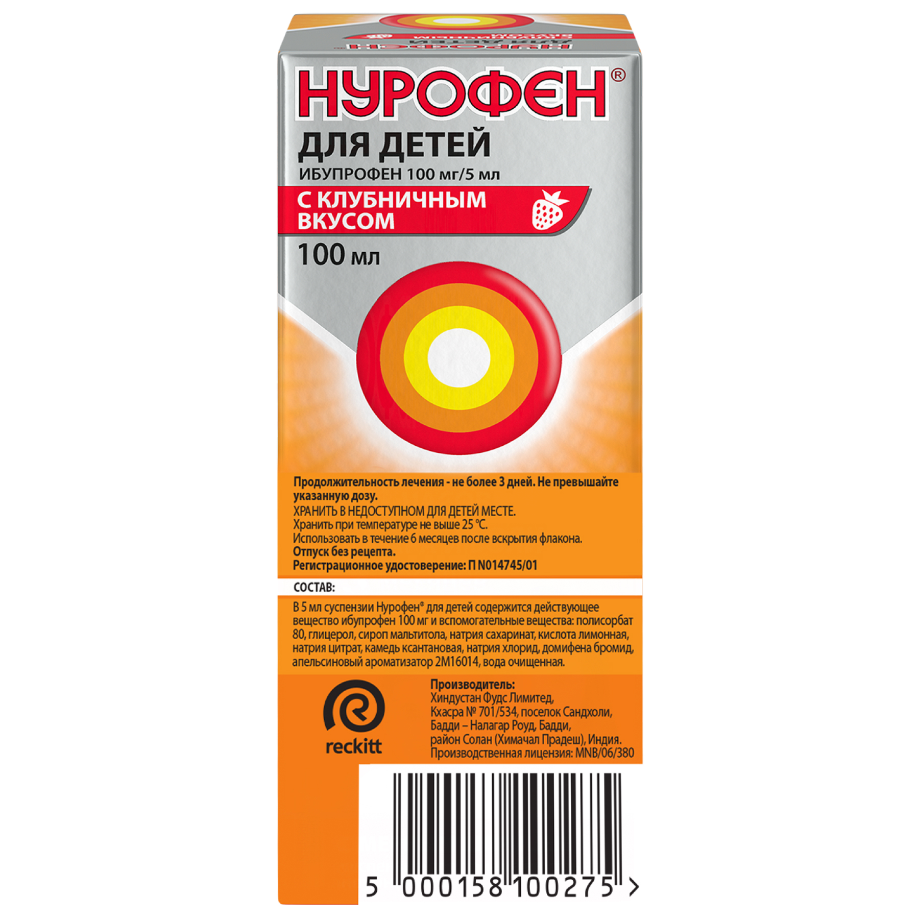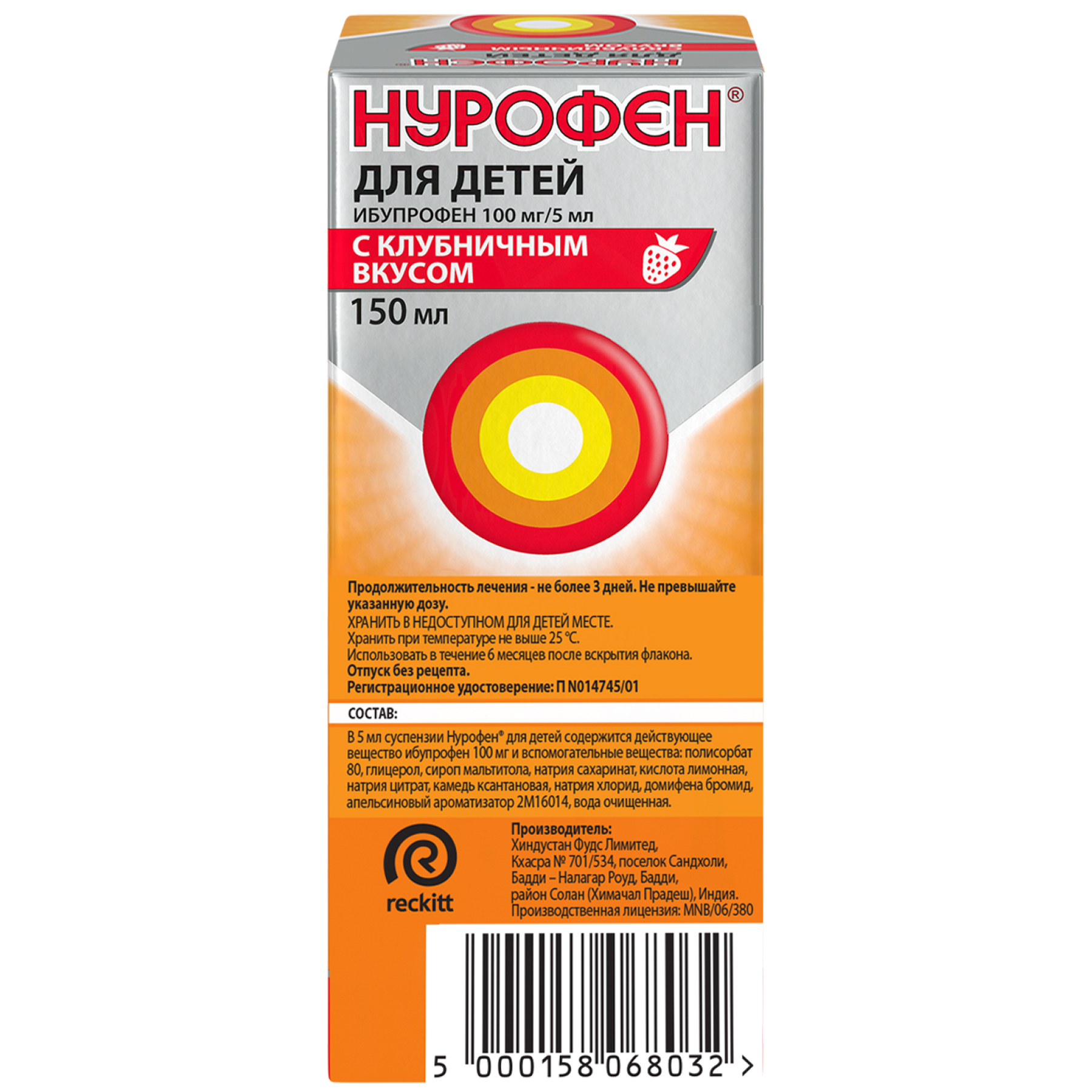 Нурофен суспензия для приема внутрь для детей с 3 месяцев 100мг/5мл 150мл апельсин