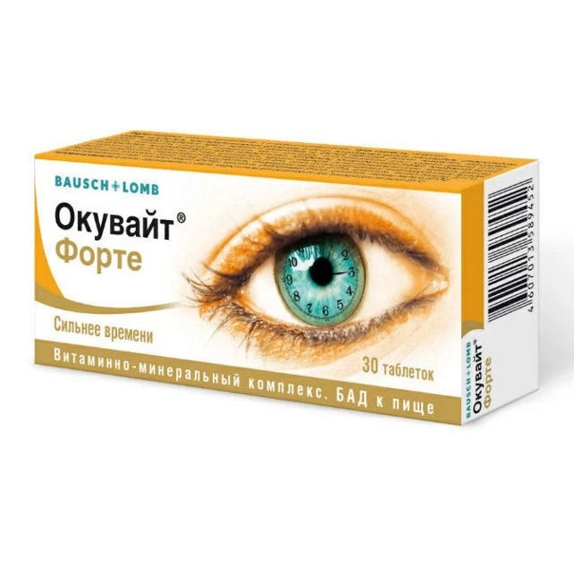 Таблетки Окувайт форте массой 0,63 г имеют круглую форму и оранжевый цвет. На боковой части можно разглядеть оболочку и светло-желтое ядро с микрокапсулами лютеина и зеаксантина. Таблетки расфасованы в независимые ячейки блистера. В одной упаковке находится 30 штук.