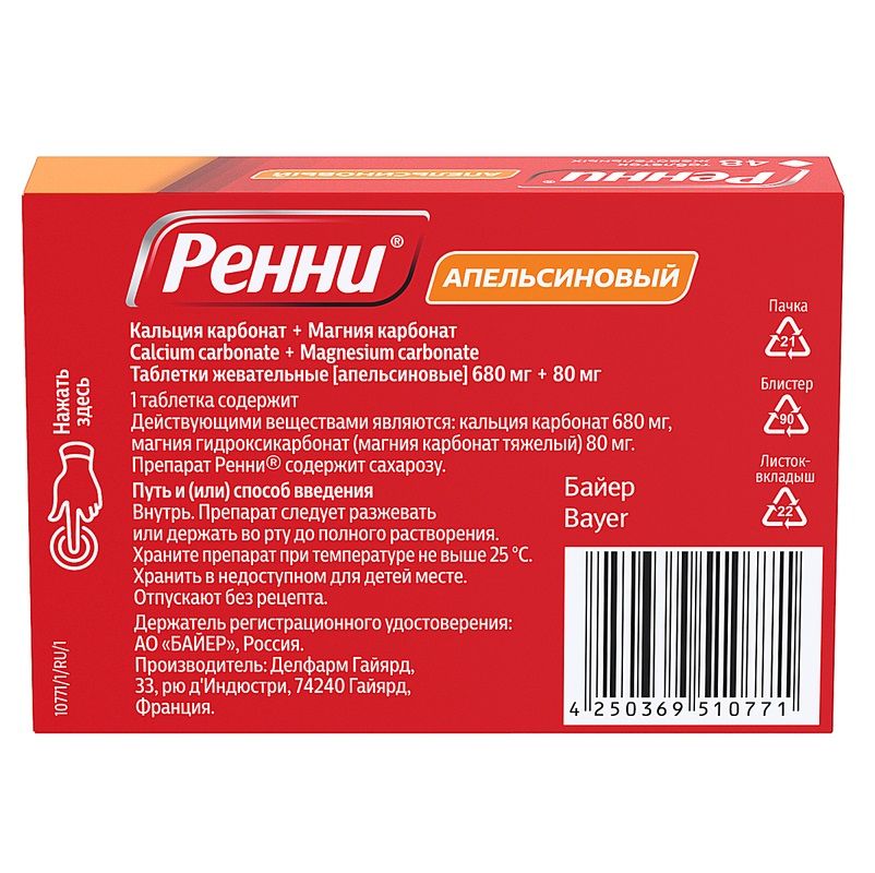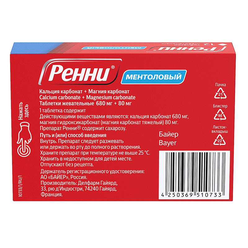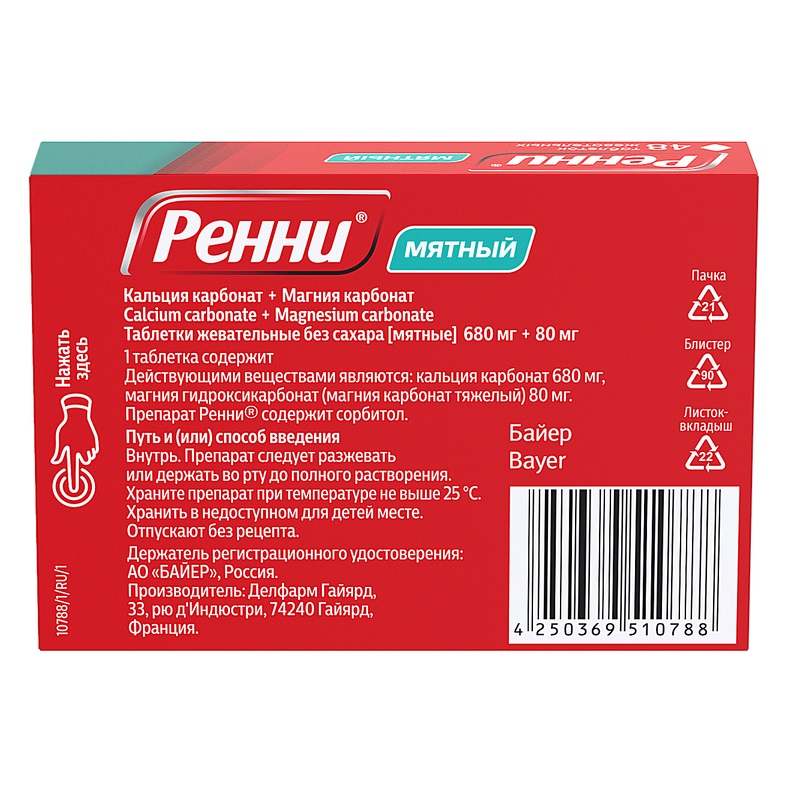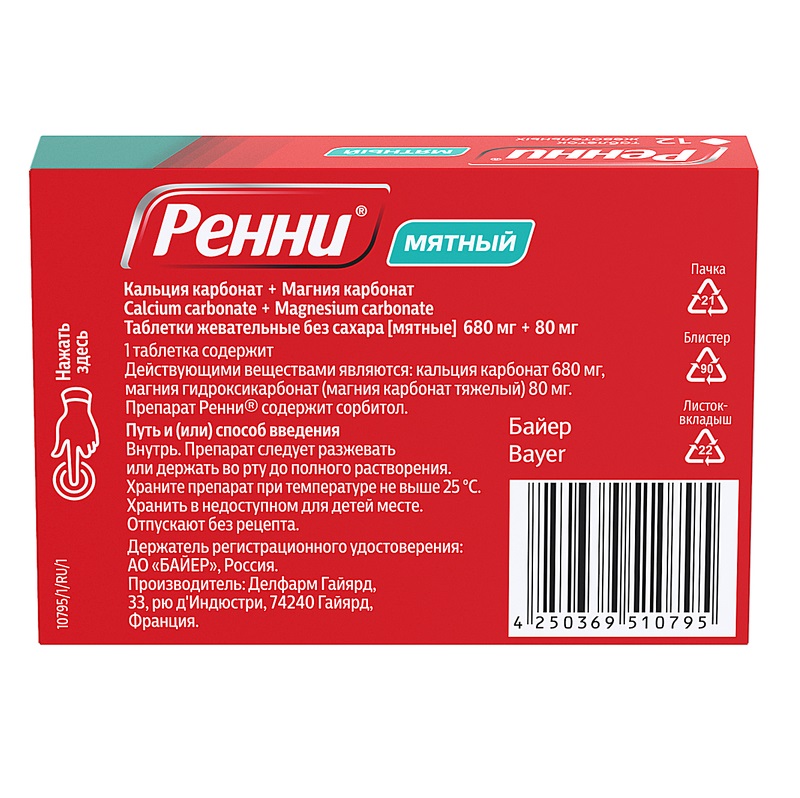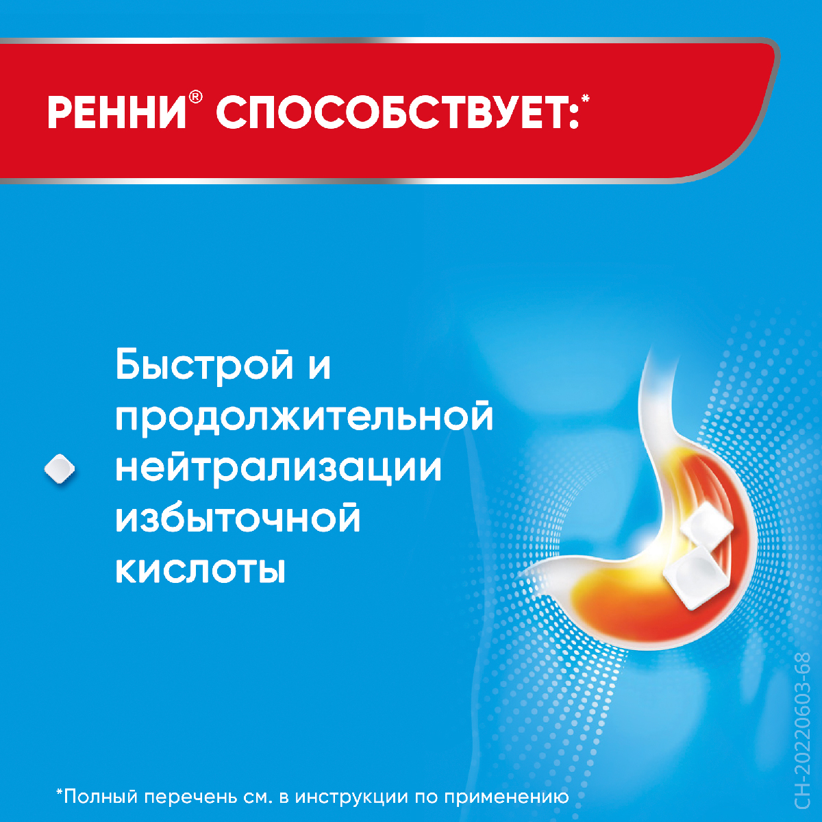 Системных побочных эффектов Ренни в клинической практике отмечено не было. Преимущественно при заранее не выявленной индивидуальной непереносимости одного из компонентов возможно развитие местных аллергических реакций. Их характерные симптомы — сыпь, зуд, болезненность, жжение, ангионевротический отек. Необходимо прекратить принимать Ренни и проконсультироваться с врачом. Он изменит режим дозирования или назначит более безопасный антацид.