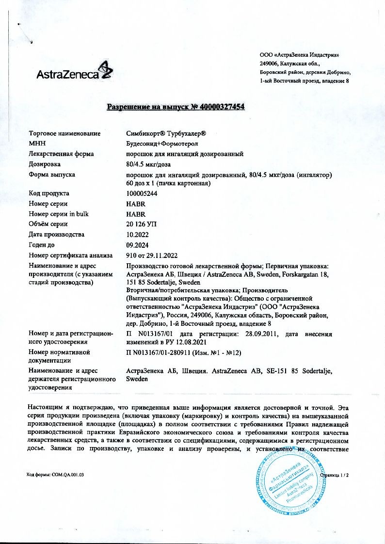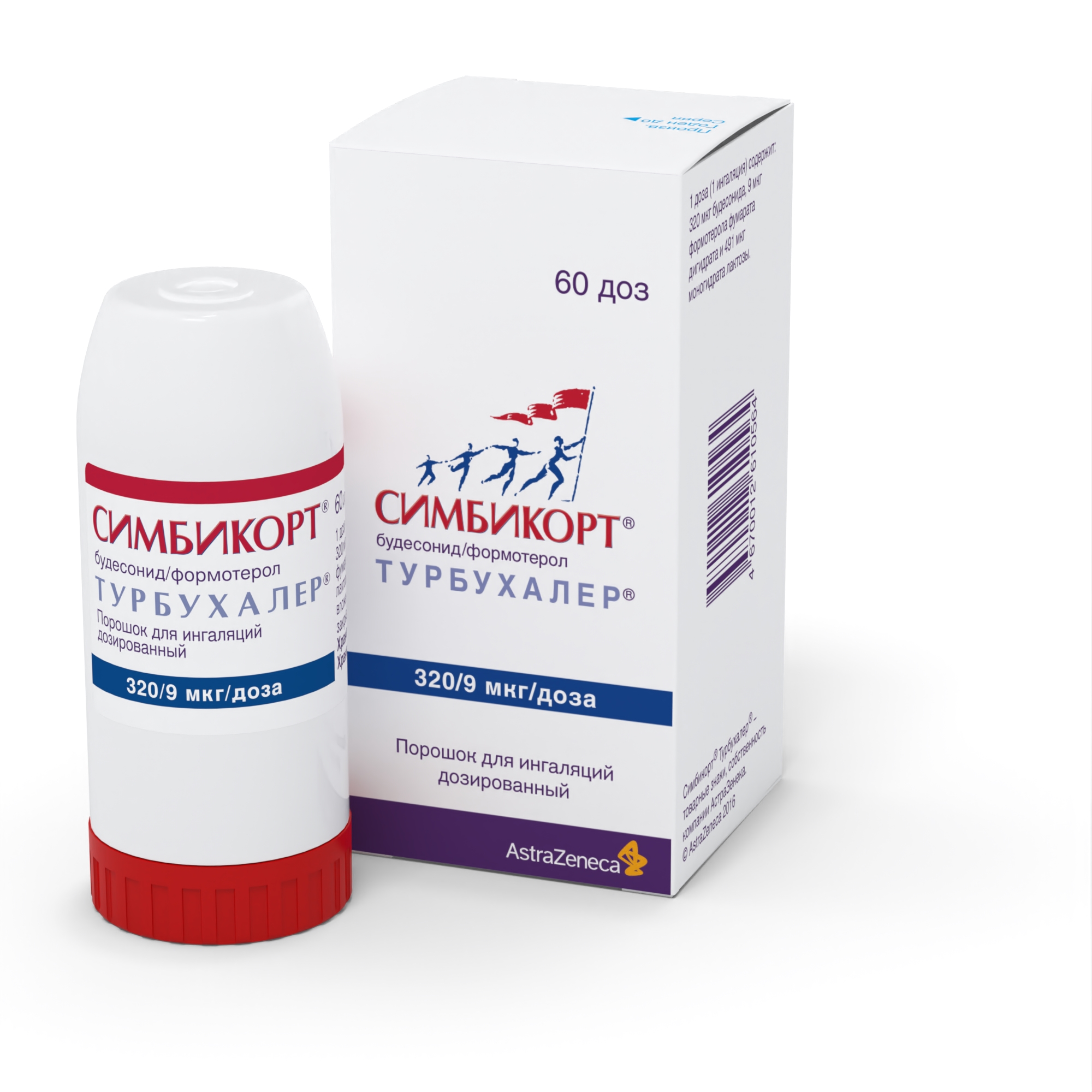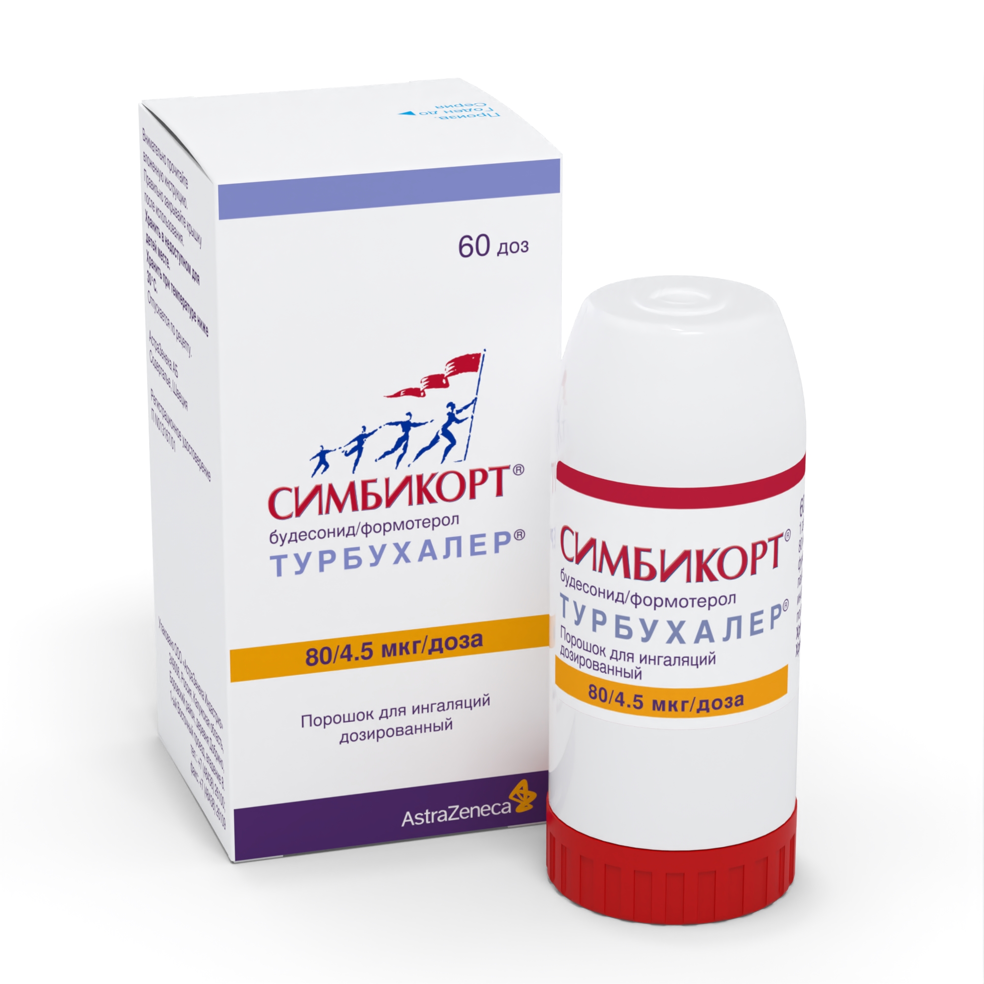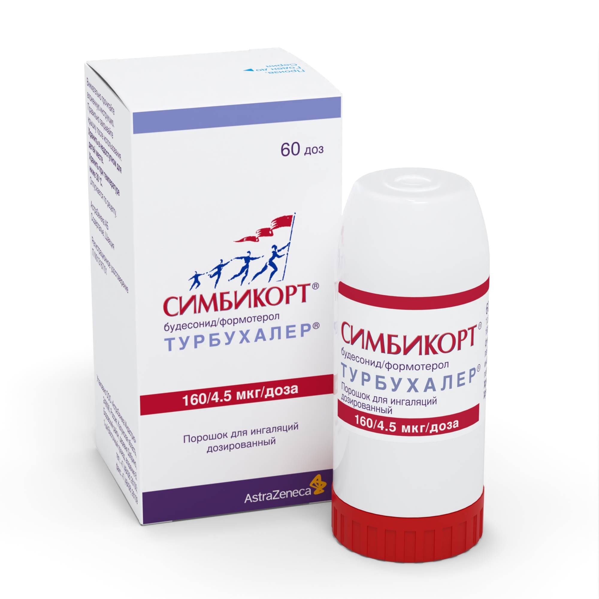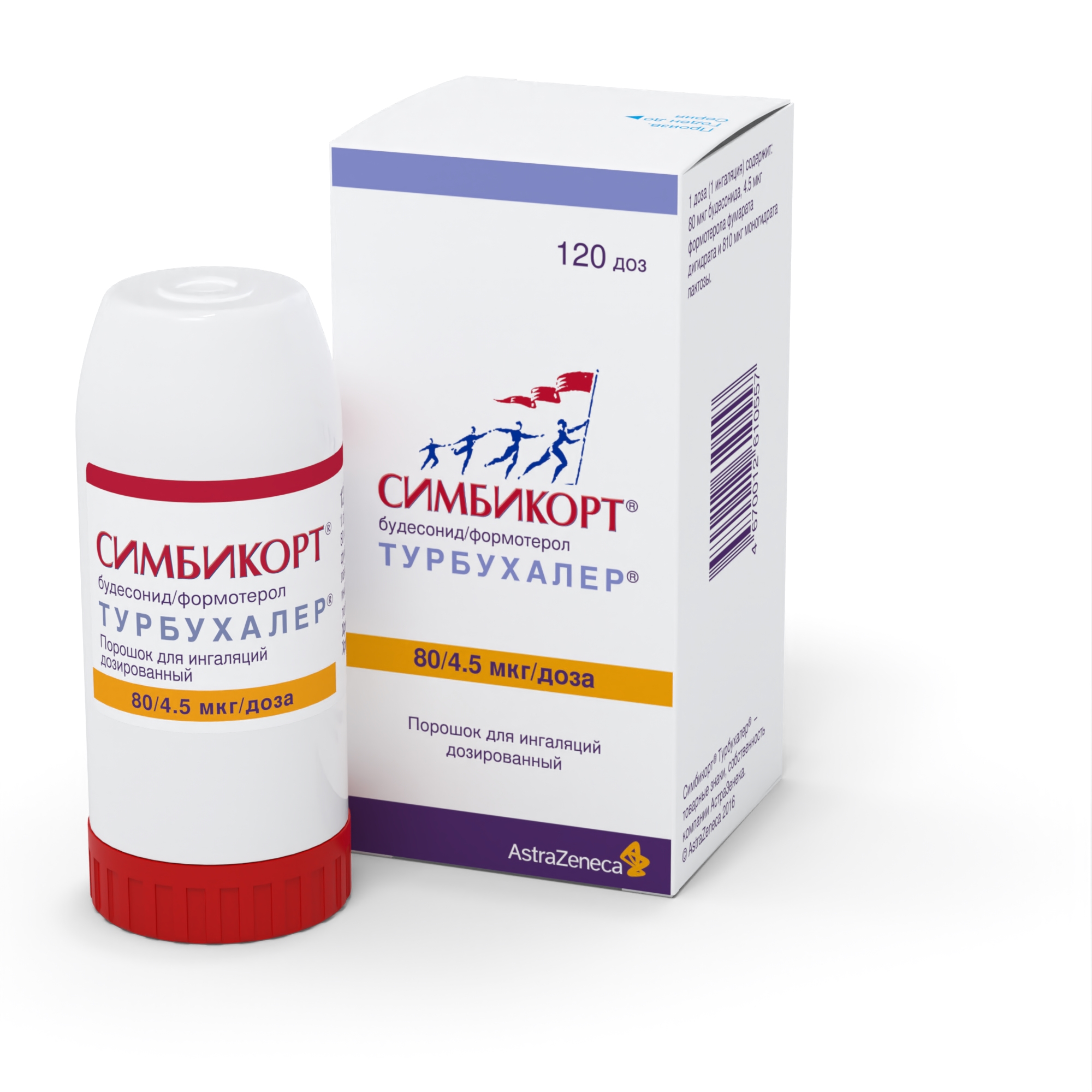 - Порошок для ингалирования Симбикорт Турбухалер (Symbicort Turbuhaler). Представлен в виде гранул белого или почти белого цвета, преимущественно округлых. В ингаляторе находится 60 доз (120 доз в больших дозировках средства). Сам ингалятор представляет собой пластиковый флакон с контролем первого вскрытия (защитной пленкой). Каждый флакон укладывается в отдельную картонную пачку.