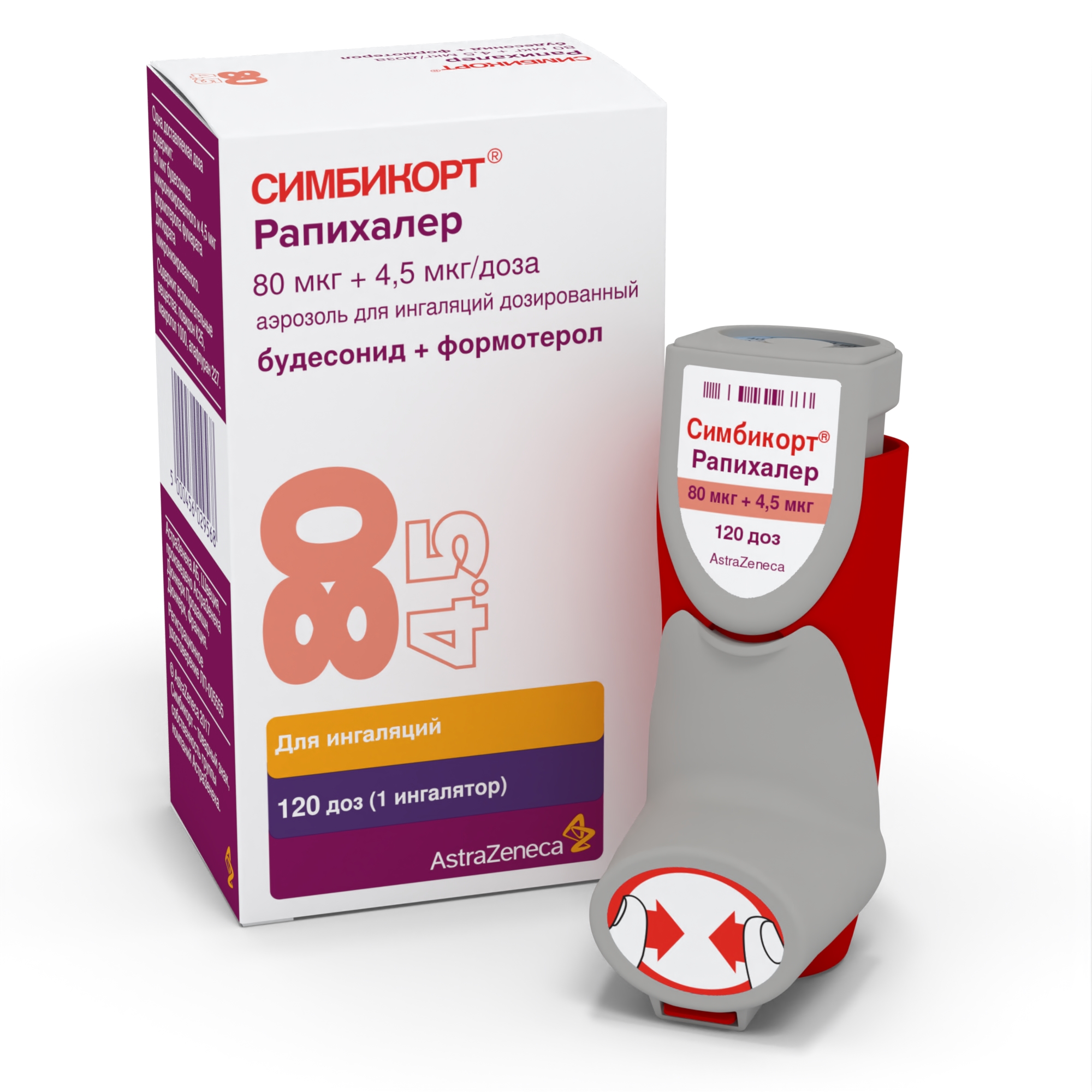 - Аэрозоль для ингалирования Симбикорт Рапихалер (Symbicort Rapyhaler). В ингаляторе находится твердый остаток белого цвета без включений. Его можно увидеть после испарения пропеллента. В каждом флаконе находится 120 доз. Ингалятор упаковывается в фольгированные алюминиевые пакеты с ламинацией и десикантом. В свою очередь, они укладываются в картонные пачки.