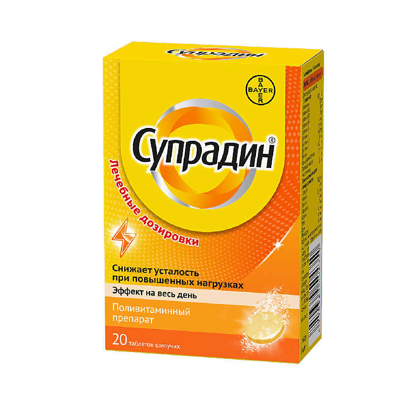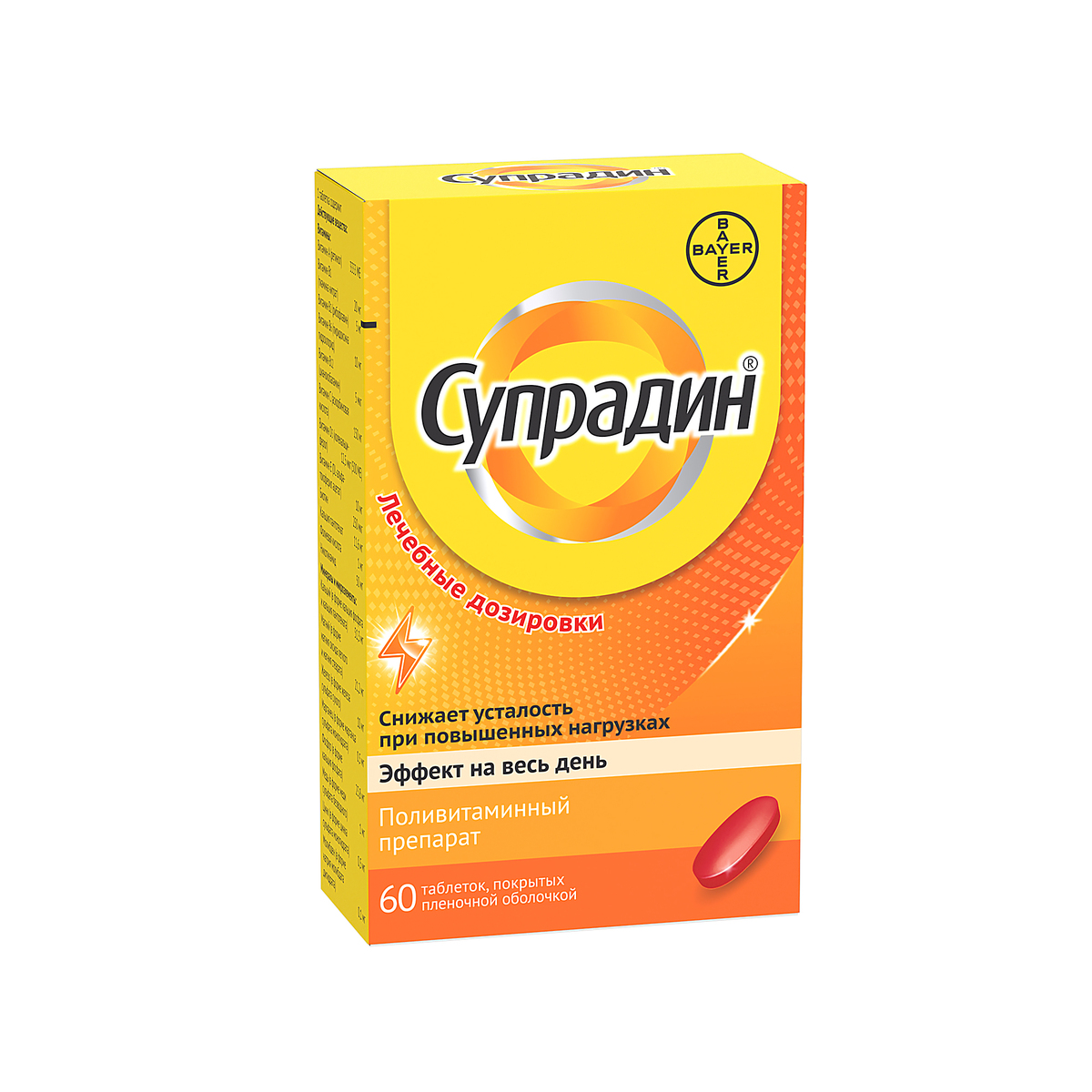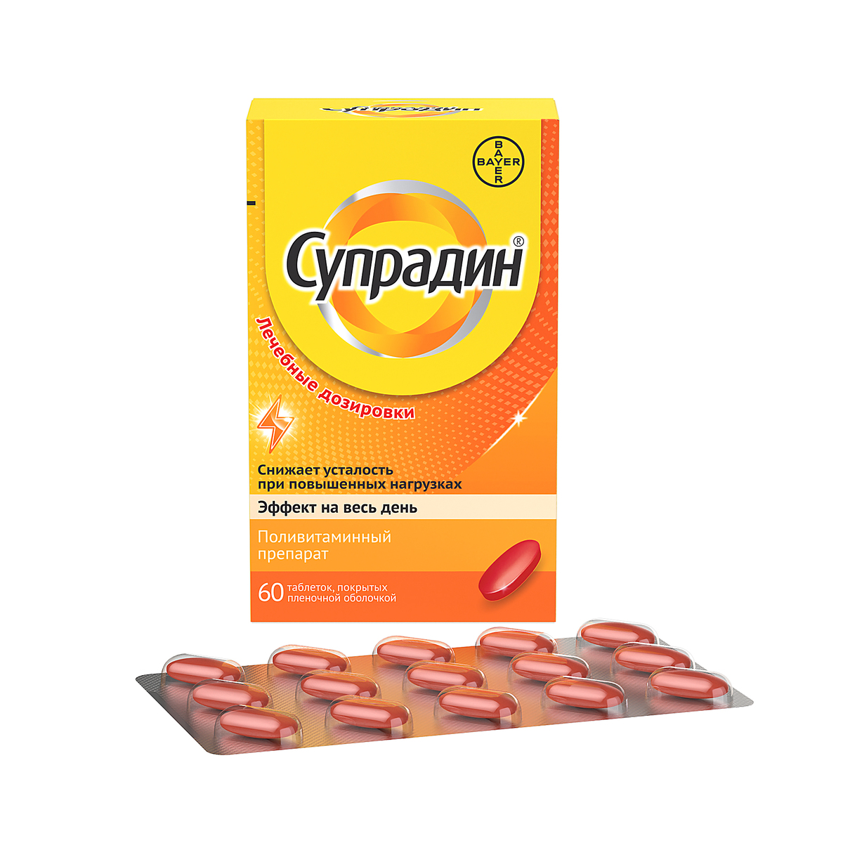 Супрадин выпускается швейцарской фармацевтической компанией Байер в форме продолговатых коричнево-красных таблеток с кишечнорастворимой оболочкой. Они расфасованы в пластиковые флаконы с навинчивающейся крышкой. Каждый вложен в картонную коробку вместе с подробной инструкцией по применению. Активный состав витаминно-минерального средства сформирован из таких ингредиентов: